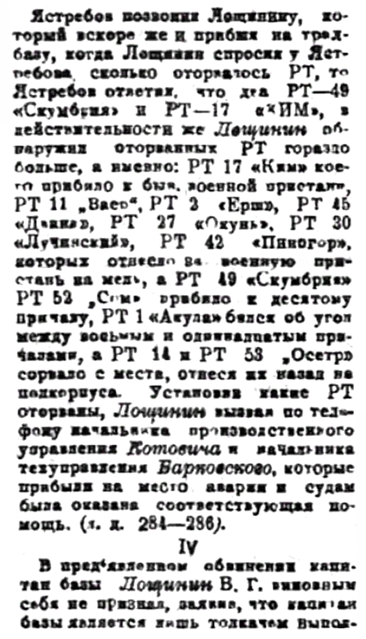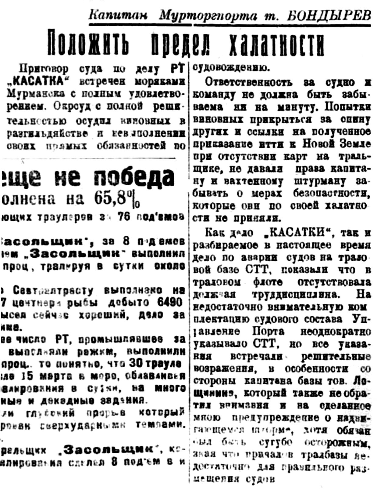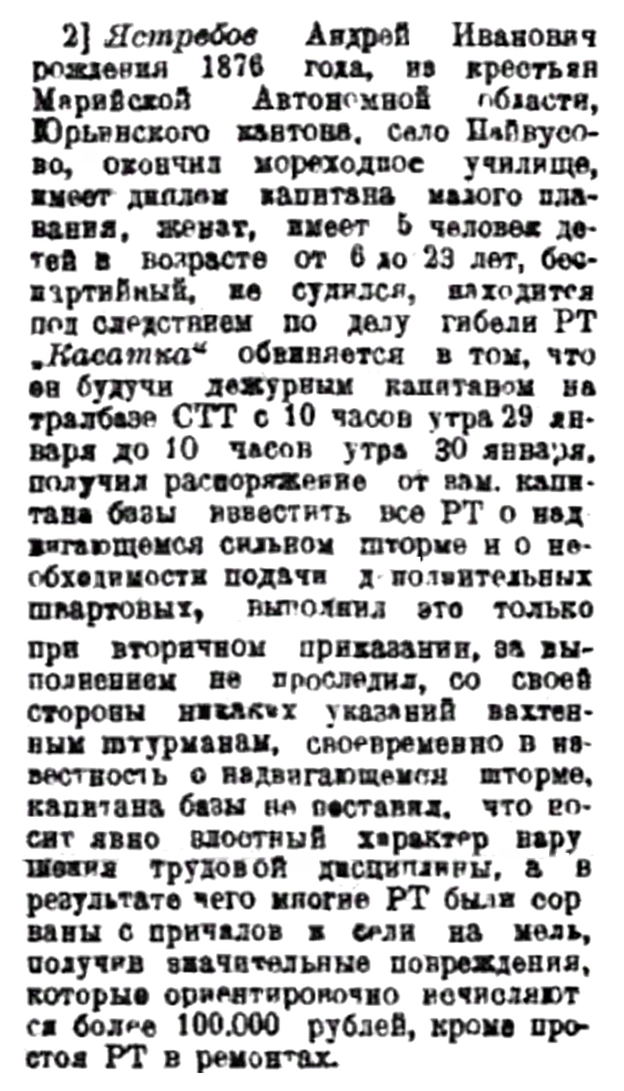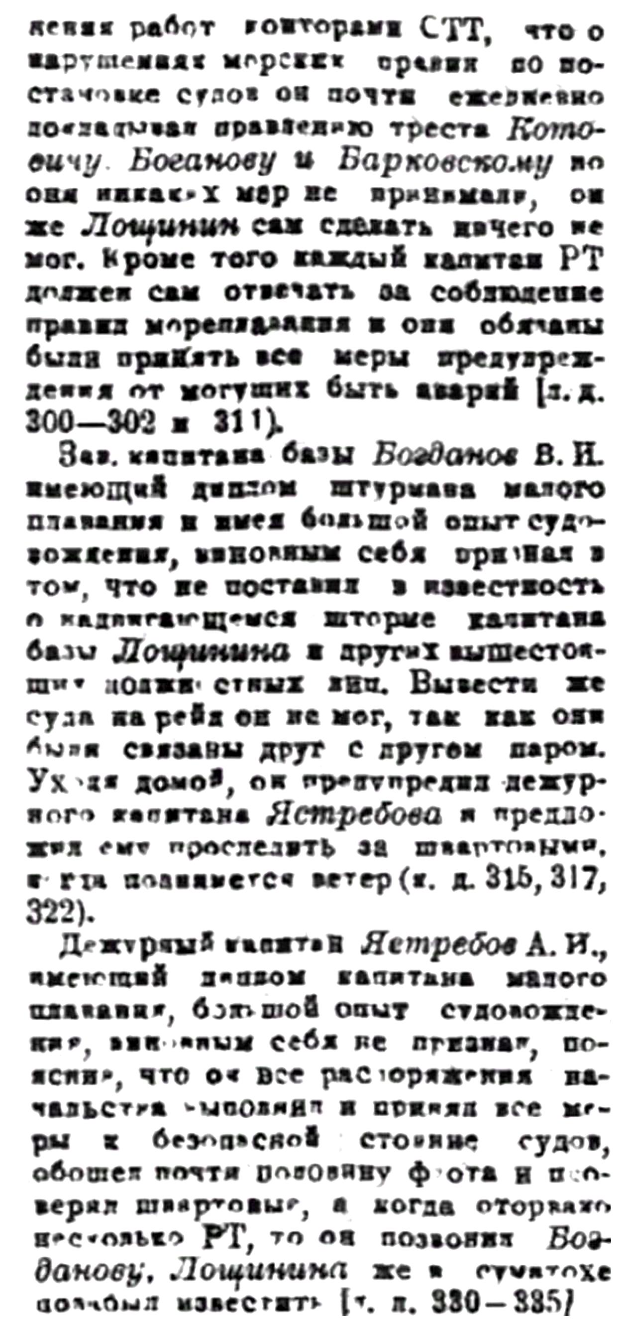 Как дело "КАСАТКИ", так и разбираемое в настоящее время дело по аварии судов на траловой базе СТТ, показали что в траловом флоте отсутствовала должная труддисциплина. На недостаточно внимательную комплектацию судового состава Управление Порта неоднократно указывало СТТ, но все указания встречали решительные возражения, в особенности со стороны капитана базы тов. Лощинина, который также не обратил внимания и на сделанное мною предупреждение о надвигающемся шторме, хотя обязан