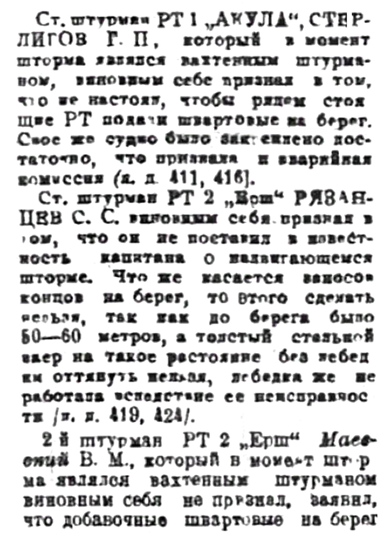 Аварийная комиссия в своих актах подробно отметила вину каждого в отдельности командира судна и береговой администрации. Приговор Окрсуда несомненно будет самый решительный, т. к. в рядах флота недолжно быть расхлябанности и разгильдяйства.
