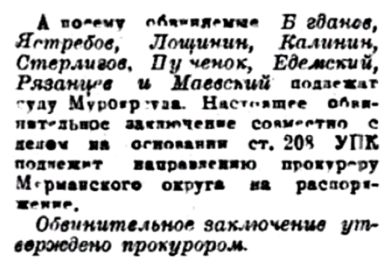 А посему обвиняемые Богданов, Ястребов, Лощинин, Калинин, Стерлигов, Пунченок, Едемский, Рязанцев и Маевский подлежат суду Мурокрсуда. Настоящее обвинительное заключение совместно с делом на основании ст. 204 УПК подлежит направлению прокурору Мурманского округа на распоряжение.