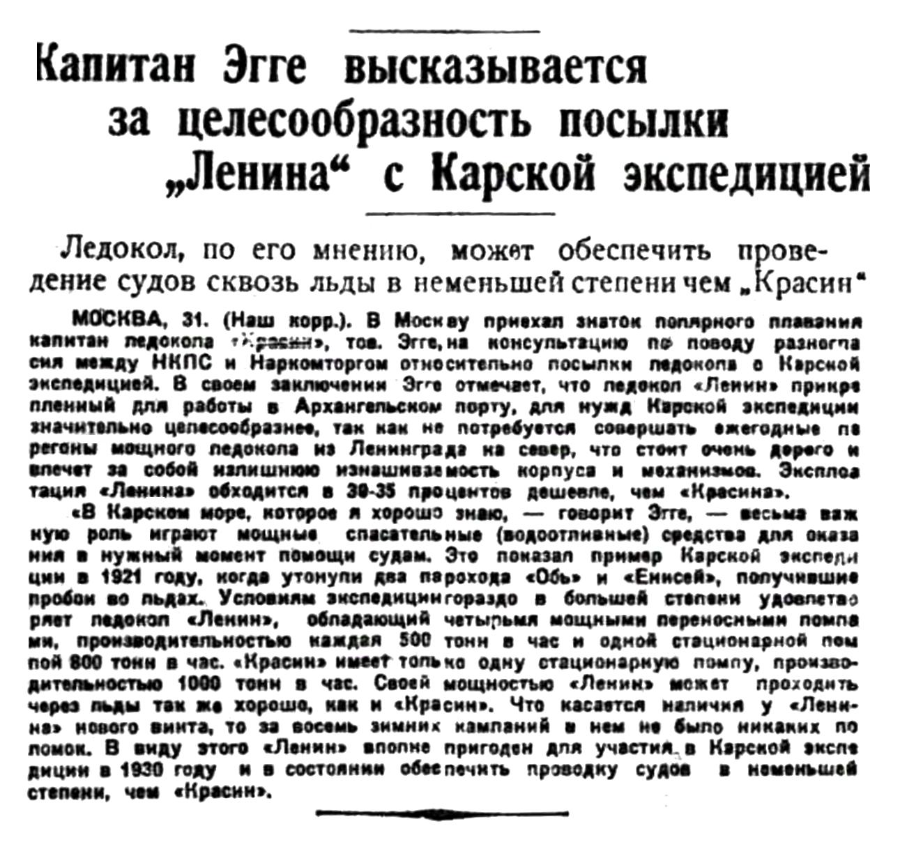 Карской экспедицией. В своем заключении Эгге отмечает, что ледокол "Ленин" прикрепленный для работы в Архангельском порту, для нужд Карской экспедиции значительно целесообразнее, так как не потребуется совершать ежегодные перегоны мощного ледокола из Ленинграда на север, что стоит очень дорого и влечет за собой излишнюю изнашиваемость корпуса и механизмов. Эксплоатация "Ленина" обходится в 30-35 процентов дешевле, чем "Красина".