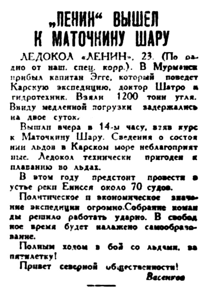 В третьих: пребывание ледокола на нашем севере выгодно еще потому, что он может работать с Карской экспедицией, о чем убедительно говорят печатаемая ниже телеграмма нашего московского корреспондента с мнением тов. Эгге, капитана прославленного "Красина".