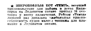 Ю. Алексеев пишет:1932-33: Северо-Восточная Полярная Экспедиция НАРКОМВОДАЭкспедиция вышла из Владивостока в июле 1932 году, не дойдя еще до Берингова пролива экспедиция встретила льды. Полетели вперед самолеты, ища проходов в казавшейся непроходимой ледяной ловушке. А по воде — вдоль ледяного барьера — вспоминает т. Алексеев — «лазала» шхуна «Темп», капитан которой установил на мостике табурет и залез на него, чтобы дальше видеть вперед...