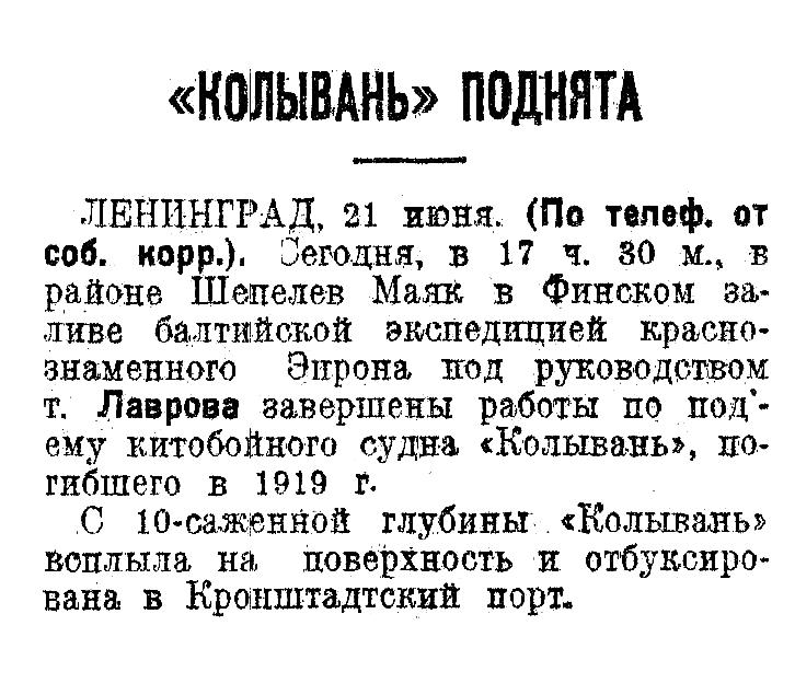 Бывшее китобойное промыслово-обрабатывающее судно "Tulla". Приобретено Морведом 26.10.1913 г. в качестве портового судна "Колывань" для строящейся Ревельской крепости. В феврале 1918 г. совершило переход из Ревеля в Гельсингфорс, а в апреле 1918 г. — в Кронштадт. 10.08.1918 г. подорвалось на мине в Финском заливе и затонуло. Поднято в 1936 1935 г., прошло капитально-восстановительный ремонт и переоборудование. В 1939 г. вошло в состав Балтийской партии ЭПРОН в качестве спасательного судна. 23.06.1941 г. мобилизовано и включено в состав АСС КБФ. Участвовало в перебазировании флота из Таллинна в Кронштадт, шло в конвое № 3. Погибло 28.08.1941 г. от подрыва на мине у м. Юминда. Водоизмещение 950 т. Размерения 49.5 х 8.6 х 4.3 м. ГЭУ котломашинная, 550 л.с. Скорость 8 узлов. Оборудование: шахта под днищем для спуска водолаза при волнении, рекомпрессионная камера, установка для подводной сварки и резки.