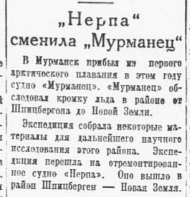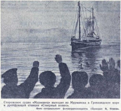 Сторожевое судно "Мурманец" выходит из Мурманска в Гренландское море к дрейфующей станции "Северный полюс". Газета "Правда" 13 января 1938 г