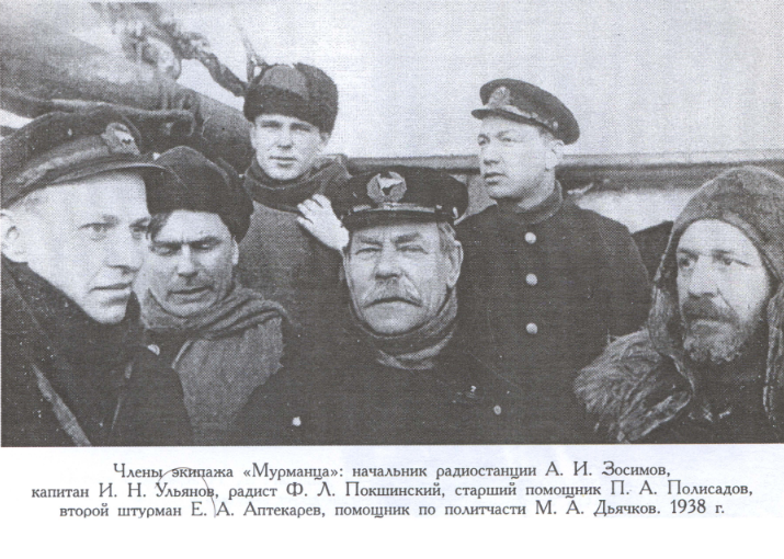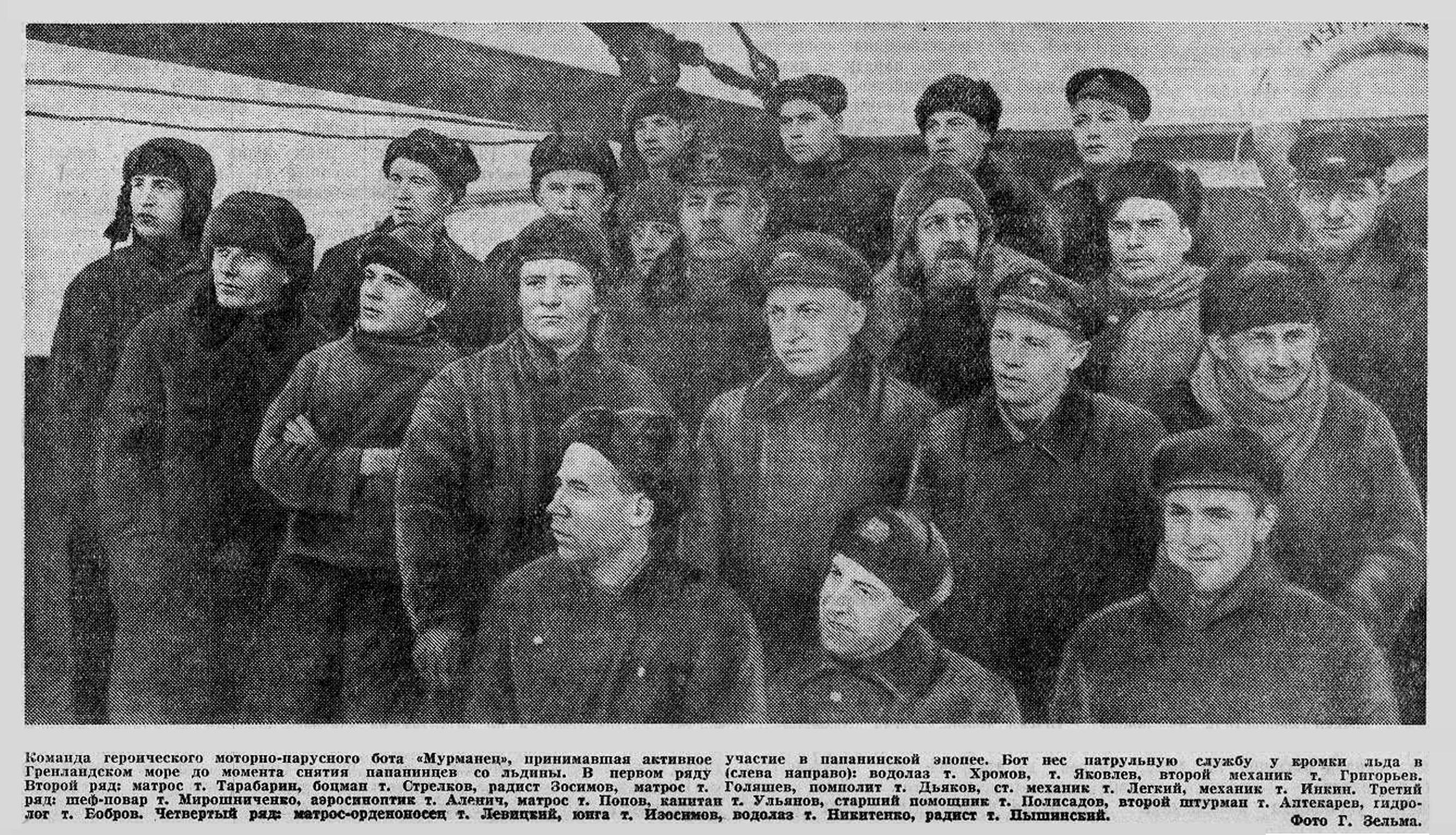 Команда героического моторно-парусного бота «Мурманец», принимавшая активное участие в папанинской эпопее. Бот нес патрульную службу у кромки льда в Гренландском море до момента снятия папапинцев со льдины. В первом ряду (слева направо): водолаз т. Хромов, т. Яковлев, второй механик т. Григорьев. Второй ряд: матрос т. Тарабарин, боцман т. Стрелков, радист Зосимов, матрос т. Голяшев, помполит т. Дьяков, ст. механик т. Легкий, механик т. Инкин. Третий ряд: шеф-повар т. Мирошниченко, аэросиноптик т. Аленич, матрос т. Попов, капитан т. Ульянов, старший помощник т. Полисадов, второй штурман т. Аптекарев, гидролог т. Бобров. Четвертый ряд: матрос-орденоносец т. Левицкий, юнга т. Изосимов, водолаз т. Никитенко, радист т. Пышинский.
