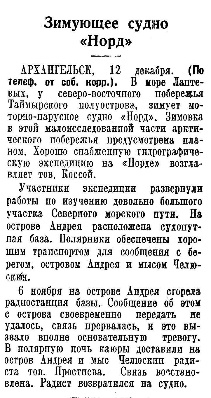 АРХАНГЕЛЬСК, 12 декабря. (По телеф. от соб. корр.). В море Лаптевых, у северо-восточного побережья Таймырского полуострова, зимует моторно-парусное судно «Норд». Зимовка в этой малоисследованной части арктического побережья предусмотрена планом. Хорошо снабженную гидрографическую экспедицию на «Норде» возглавляет тов. Косой.