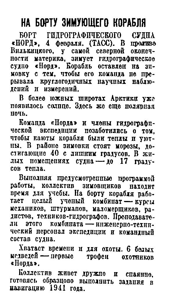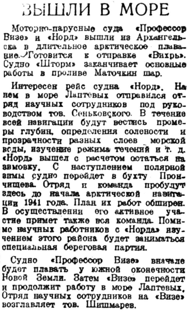 Интересен рейс судна «Норд». На нем в море Лаптевых отправился отряд научных сотрудников под руководством тов. Сеньковского (заместитель начальника экспедиции). В течение всей навигации будут вестись промеры глубин, определения солености и прозрачности разных слоев морской веды, изучение режима течений и т. д. «Норд» вышел с расчетом остаться на зимовку. С наступлением полярной зимы судно перейдет в бухту Прончищева. Отряд и команда пробудут здесь до начала арктической навигации 1941 года. План их работ обширен. В осуществлении его активное участив примет также вся команда. Помимо научных работников с «Норда» изучением этого района будет заниматься специальная береговая партия.
