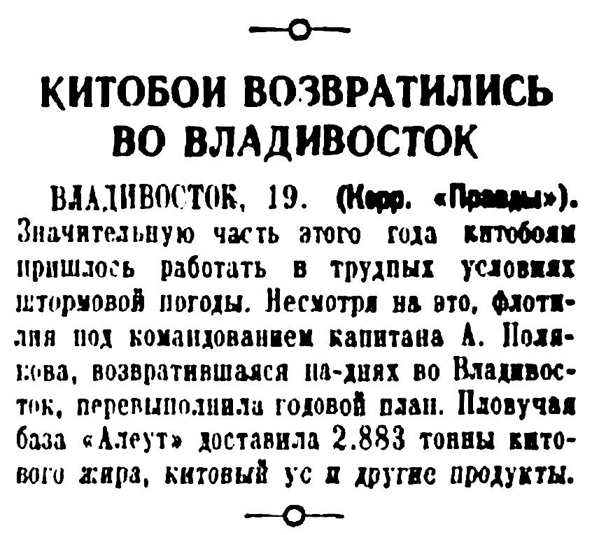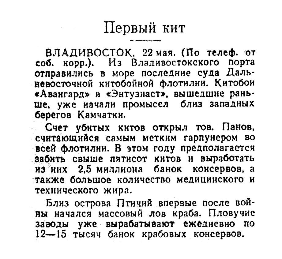 Сегодня мы печатаем корреспонденцию А. Томилина «Охота на китов», в которой автор между прочим сообщает, что в этом году советской китобойной флотилией среди других китов добыто 150 финвалов, достигающих в длину 22 метров.