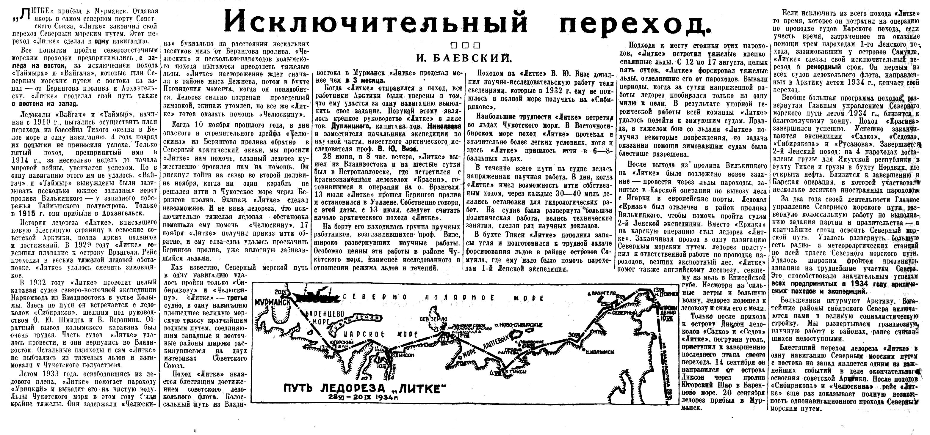 Копия оригинала (текст дан ранее) - страница из газеты «Правда» от 21 сентября 1934 г. №261 со статьёй И.Баевского о походе ледореза «Ф.Литке» из Владивостока в Мурманск.
