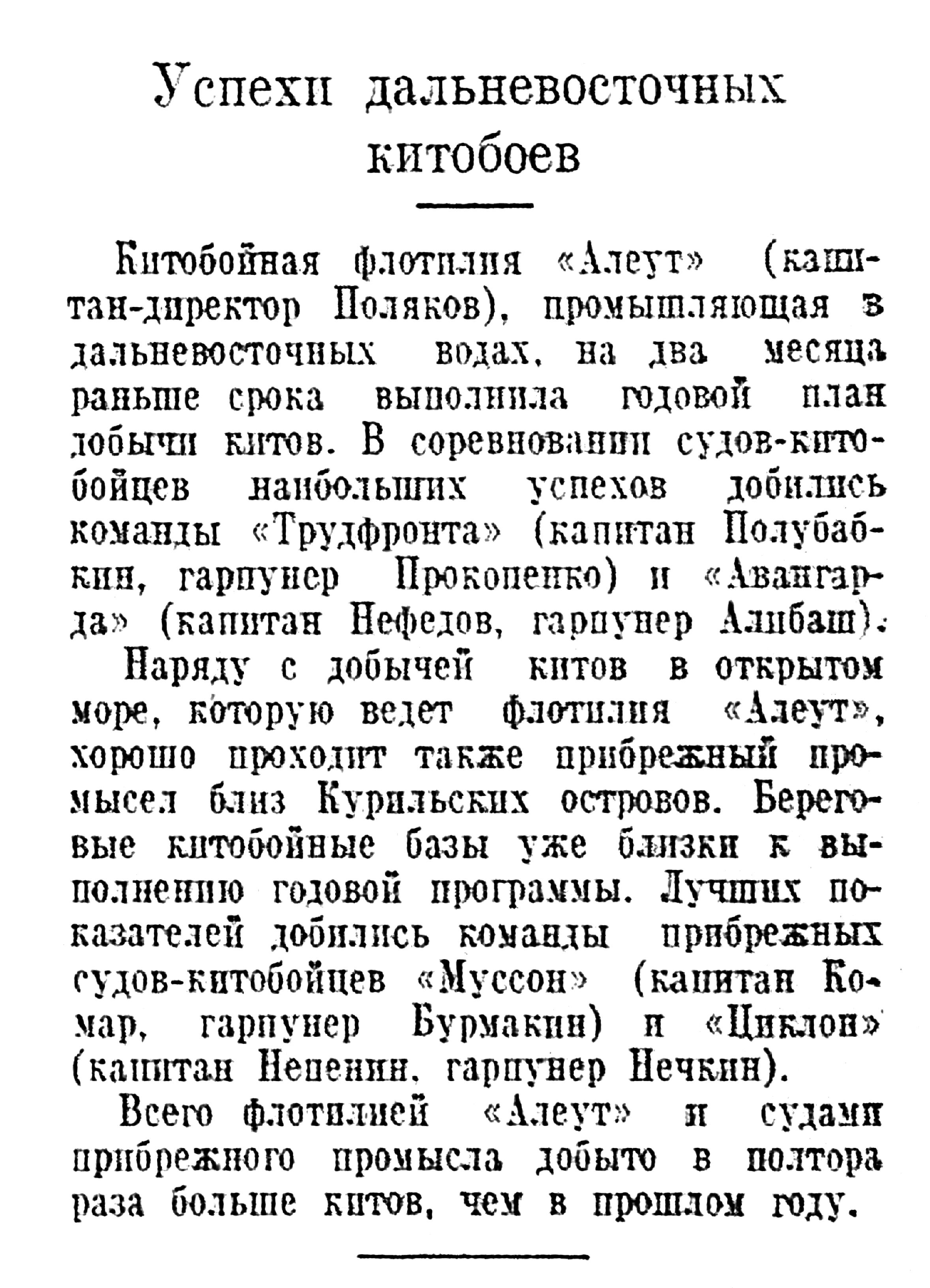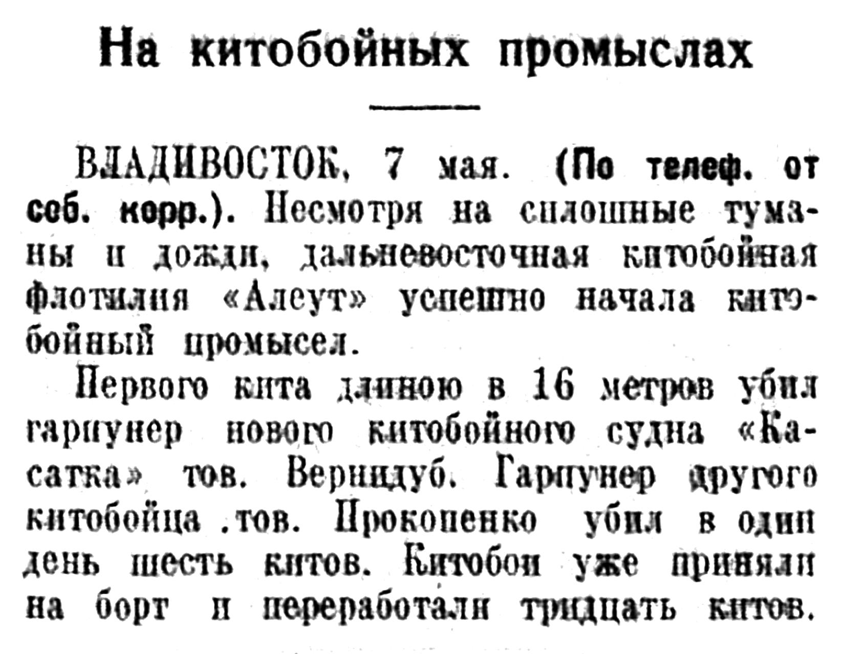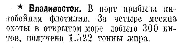 Прошли всего лишь 2 сезона шестимесячной охоты на китов в наших дальневосточных водах но уже достигнуты хорошие результаты. В 1933 г. были убиты 202 кита, а в этом году — ЗЗ9. Добыча такого количества китов дала возможность вытопить в этом году 2.028 тони сала, заготовить 160 тонн китового уса и зуба и выработать 4.403 ящика консервов.