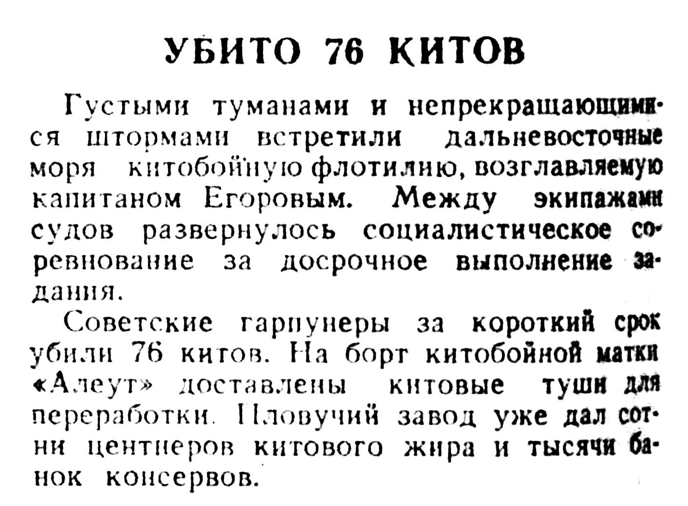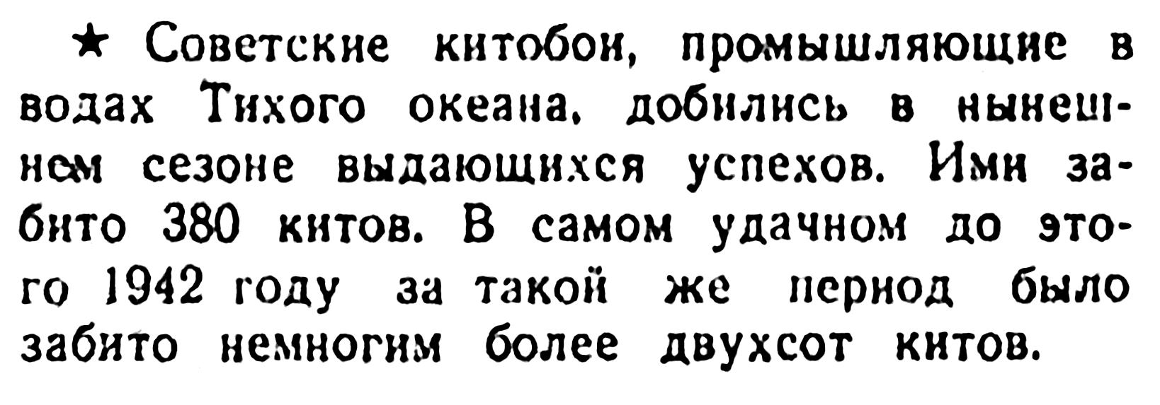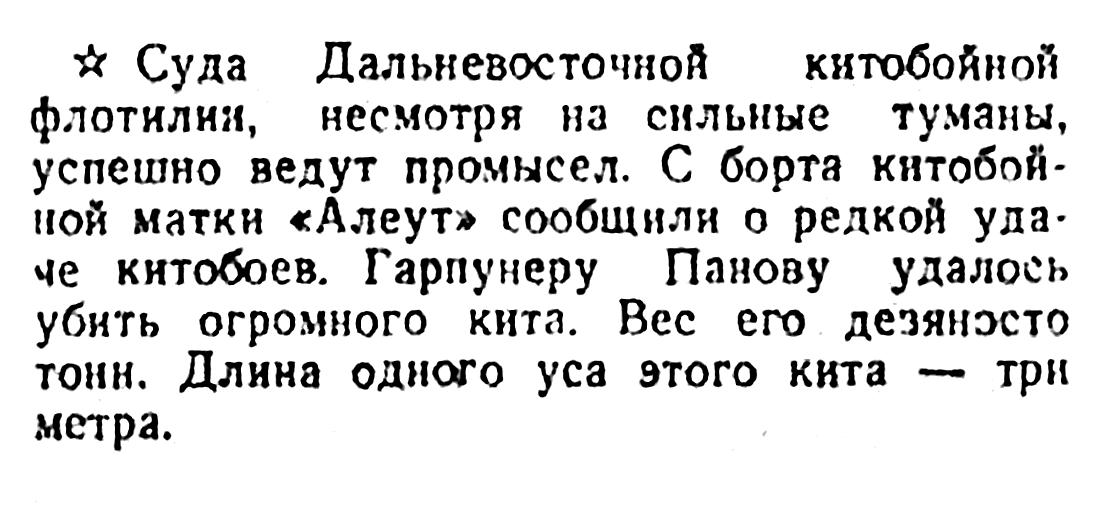 Сегодня мы печатаем корреспонденцию А. Томилина «Охота на китов», в которой автор между прочим сообщает, что в этом году советской китобойной флотилией среди других китов добыто 150 финвалов, достигающих в длину 22 метров.
