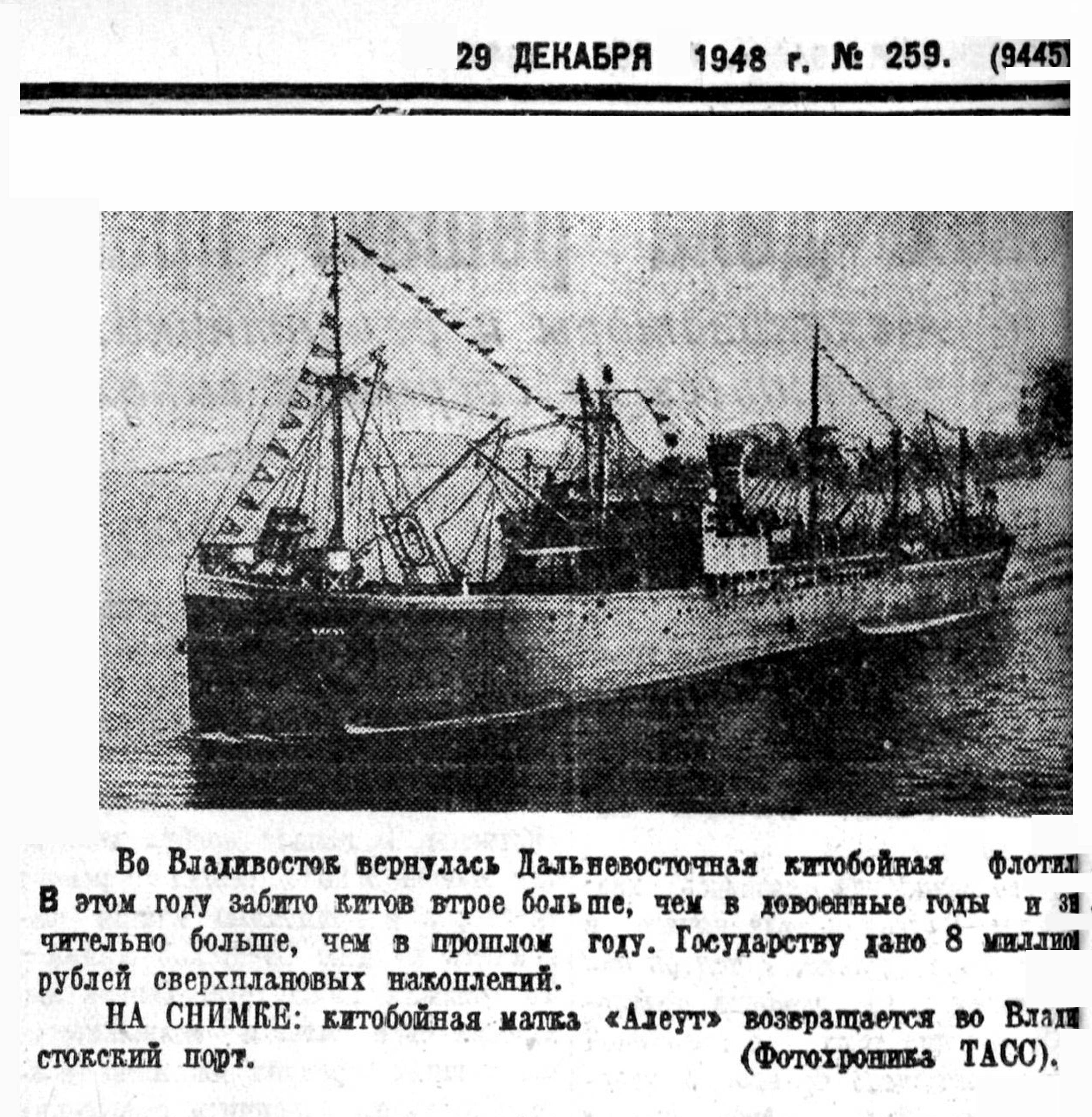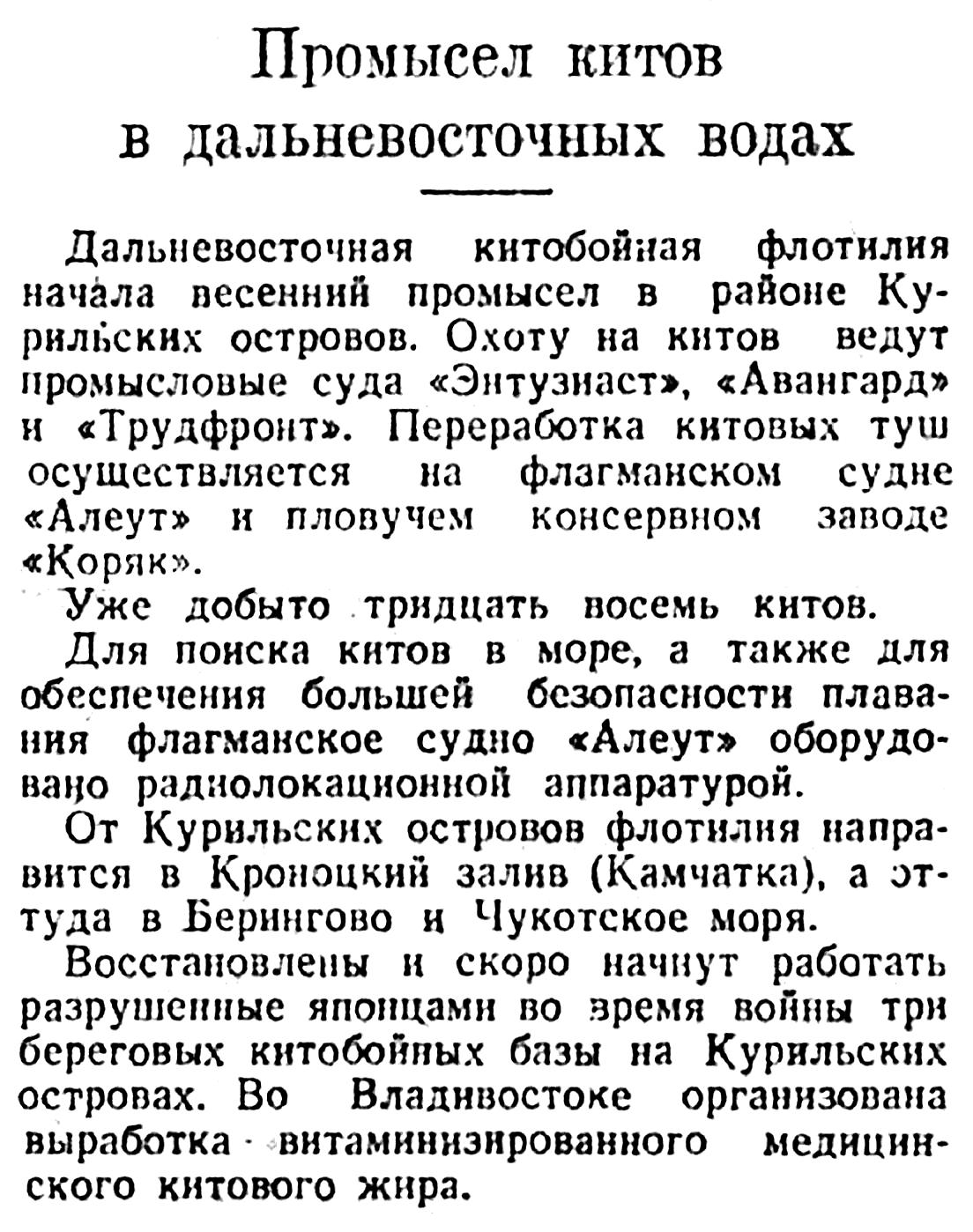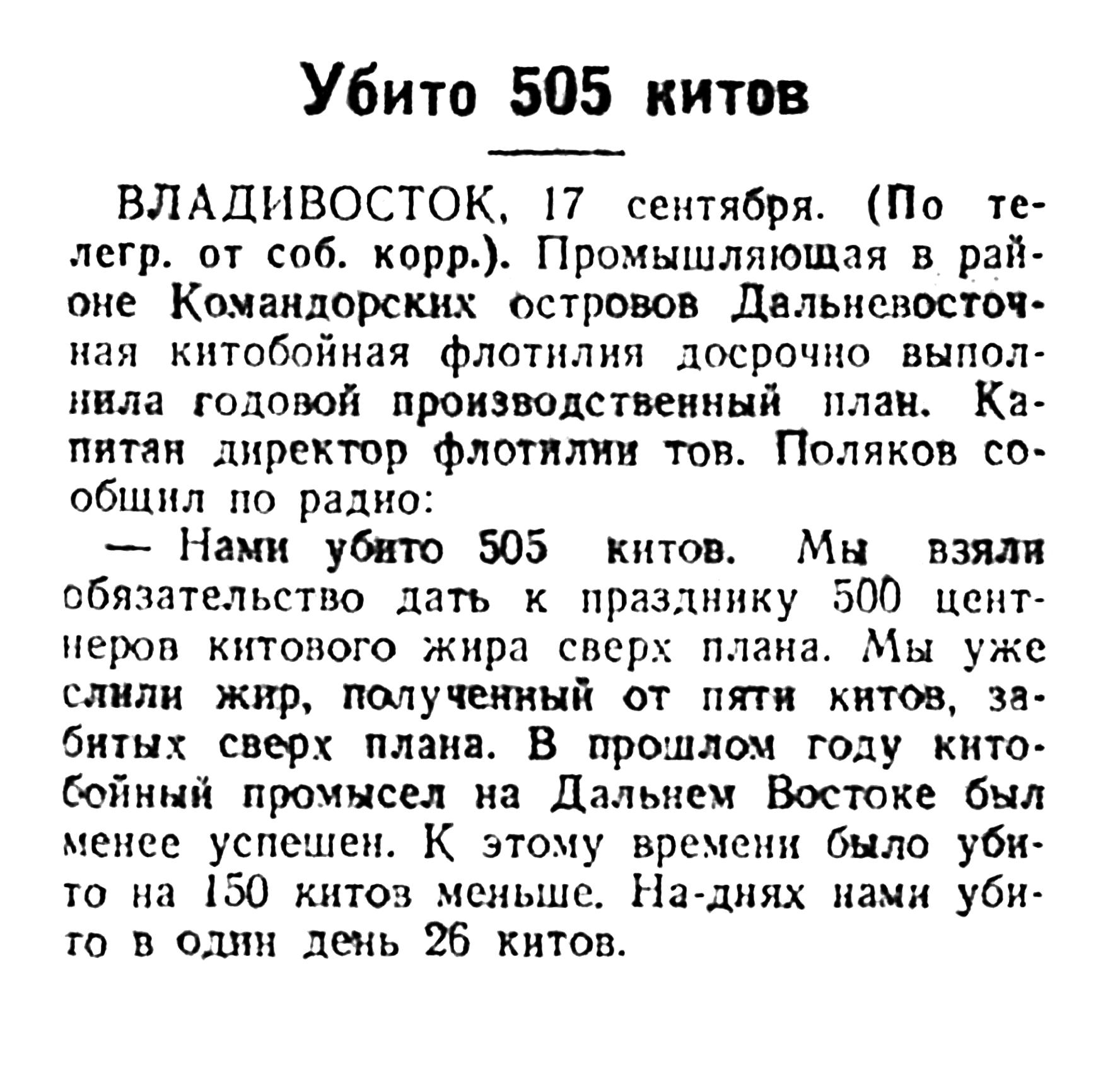 Сегодня мы печатаем корреспонденцию А. Томилина «Охота на китов», в которой автор между прочим сообщает, что в этом году советской китобойной флотилией среди других китов добыто 150 финвалов, достигающих в длину 22 метров.