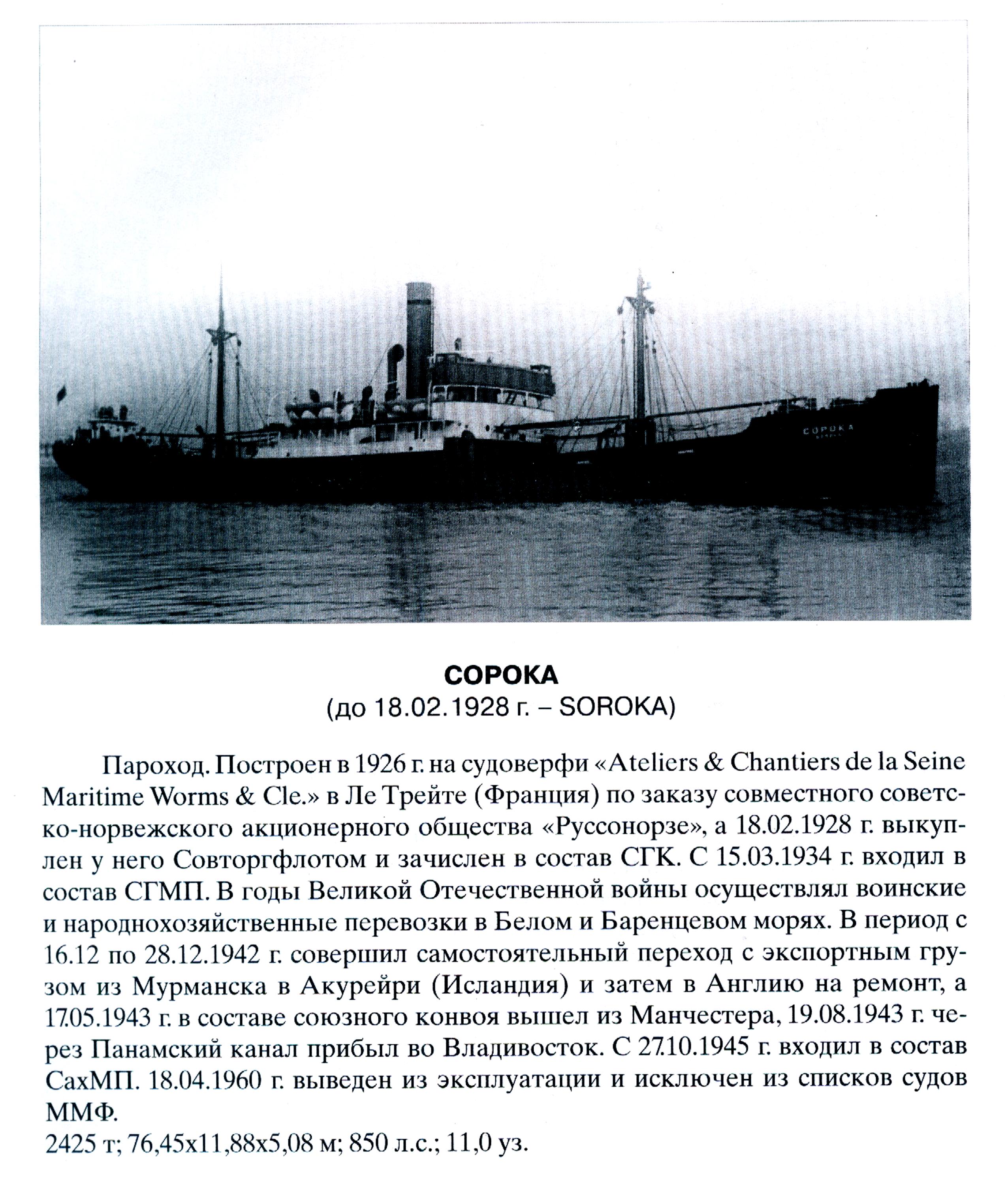Пароход. Построен в 1926 г. на судоверфи «Ateliers & Chantiers de la Seine Maritime Worms & Сlе.» в Ле Трейте (Франция) по заказу совместного советско-норвежского акционерного общества «Руссонорзе», а 18.02.1928 г. выкуплен у него Совторгфлотом и зачислен в состав СГК. С 15.03.1934 г. входил в состав СГМП. В годы Великой Отечественной войны осуществлял воинские и народнохозяйственные перевозки в Белом и Баренцевом морях. В период с 16.12 по 28.12.1942 г. совершил самостоятельный переход с экспортным грузом из Мурманска в Акурейри (Исландия) и затем в Англию на ремонт, а 17. 05. 1943 г. в составе союзного конвоя вышел из Манчестера, 19.08.1943 г. через Панамский канал прибыл во Владивосток. С 27.10.1945 г. входил в состав СахМП. 18.04.1960 г. выведен из эксплуатации и исключен из списков судов ММФ.