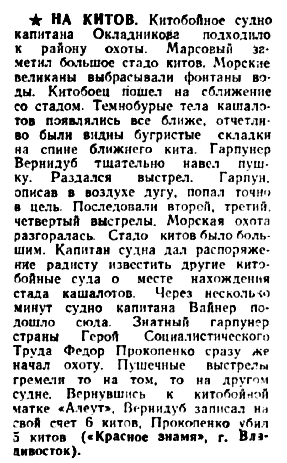 ★ 10 КИТОВ ЗА ДЕНЬ. В Беринговом море работает китобойная флотилия «Алеут». Экипаж китобойного судна капитана Кушнера досрочно завершил годовой план. На его счету уже около трех десятков китов, добытых сверх годового плана. Успешно ведет промысел команда капитана Бульмейстера. Недавно молодой гарпунер Н. Железнов убил за один день десять китов («Красное знамя», г. Владивосток).