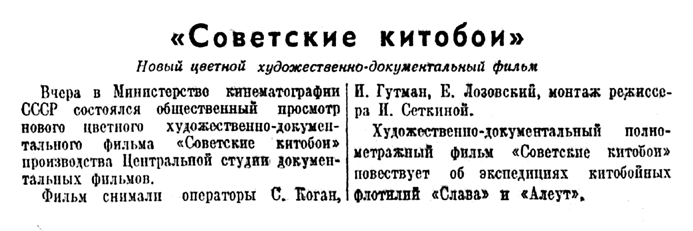 Вчера в Министерстве кинематографии СССР состоялся общественный просмотр нового цветного художественно-документального фильма «Советские китобои» производства Центральной студии документальных фильмов.