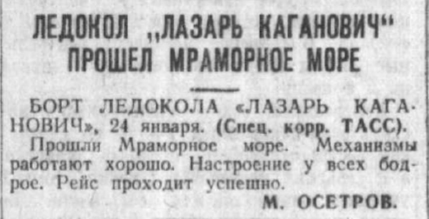Вот как описана эпопея спасения ледокола "Адмирал Лазарев" (радиограмма с борта ледокола "Ленинград" в газету "Известия", 1965 год, спецкор Юрий Тепляков).