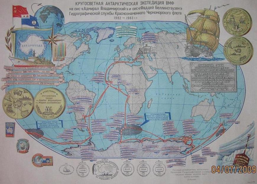 Карта "Кругосветная антарктическая экспедиция ВМФ на ОИС «Адмирал Владимирский» и ОИС «Фаддей Беллинсгаузен» Гидрографической службы Краснознаменного Черноморского флота 1982 -1983 г.г."