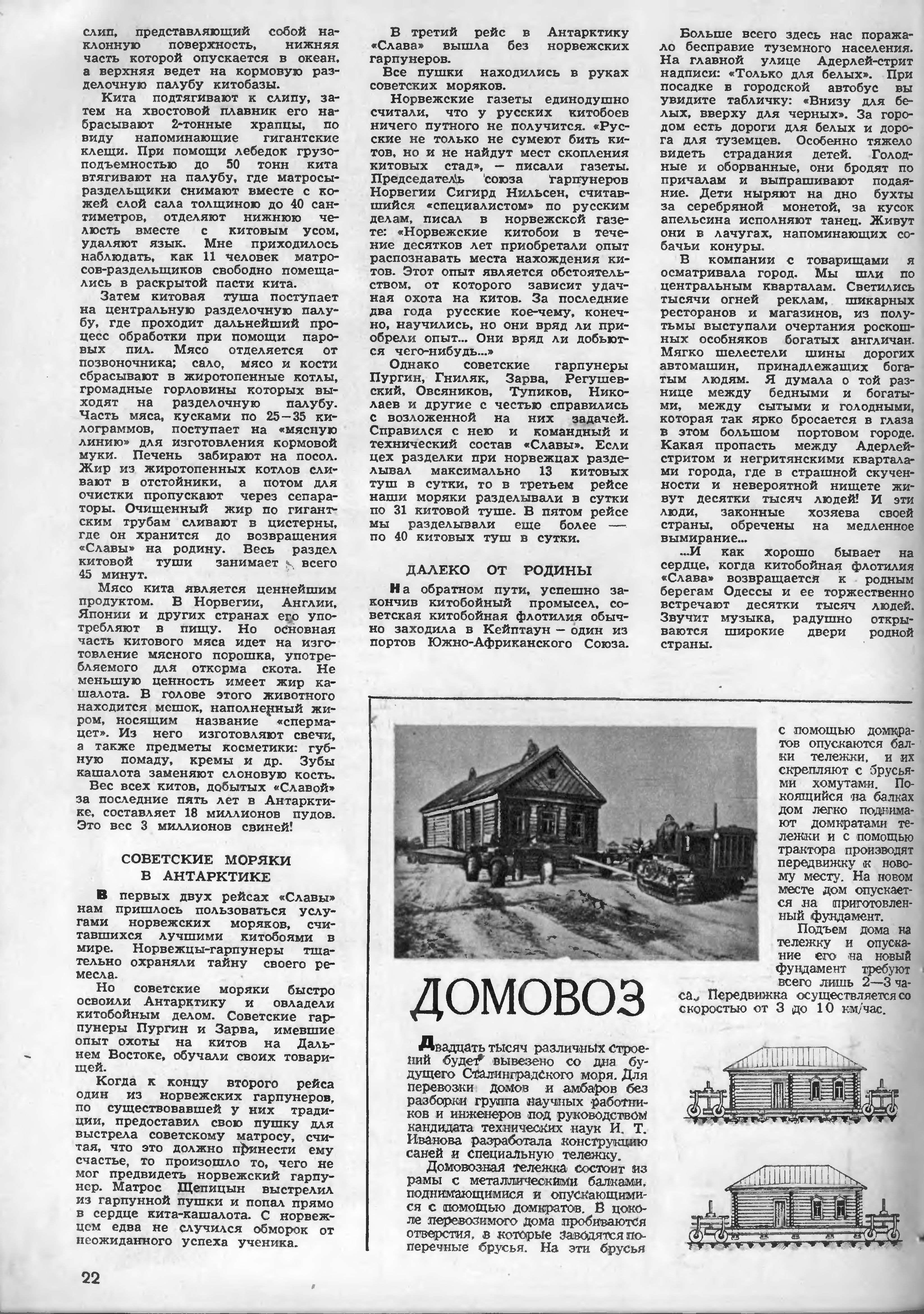 "В зиму 1946 и 1947 годов впервые в истории русского рыболовного флота суда советской китобойной экспедиции бороздили воды Антарктики, добывая китов. Экспедиция имела огромное значение: она доказала всему миру силу и мощь советского рыболовного флота, она изучила условия добычи китов в Антарктике, и, главное, она привлекла неиссякаемые богатства морей, омывающих Южный полюс, к использованию в плановом социалистическом хозяйстве нашей страны. Недавно возвратилась из дальнего плавания вторая экспедиция, осенью этого года уйдет третья. Китобойный промысел в Антарктике стал частью плана лова рыбы советского рыболовного флота.
