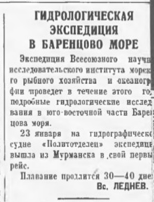 Здесь при любезном содействии Н. И. Евгенова я договорился о фрахте «Политотдельца» и заключил соответствующий договор. По договору Гидрографическое управление обязалось устранить все неполадки на корабле и подготовить его к выходу в море не позднее ноября. Судно было укомплектовано командой, и мне предстояло только подобрать в Москве членов экспедиции. Но это оказалось совсем нелегко: на летние плавания желающих хоть отбавляй, а тяжелые зимние условия мало кого привлекали. Состав экспедиции сложился следующий: гидрологи — В. А. Леднев, я и лаборант Адриан Морозов, гидрохимики — М. В. Федосов и лаборант Сергей Парусинов. Метеорологические наблюдения были возложены на штурманов, тем более что один из них, В. С. Успенский, в прошлом работал в Государственном гидрологическом институте, а потом окончил Высшее военно-морское училище. В ноябре все мы выехали в Мурманск.