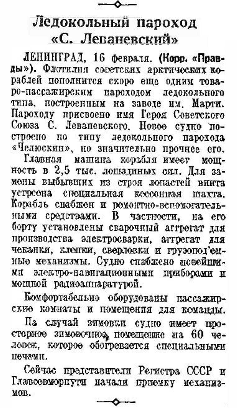 ЛЕНИНГРАД, 24 февраля. (Корр. «Правды»). На заводе им. Марти строится ледокольный корабль «С. Леваневский». Новый пароход однотипен с кораблем «С. Дежнев». Его длина — 104 метра, ширина — 15 метров. Мощность главной машины — 2.500 лошадиных сил.