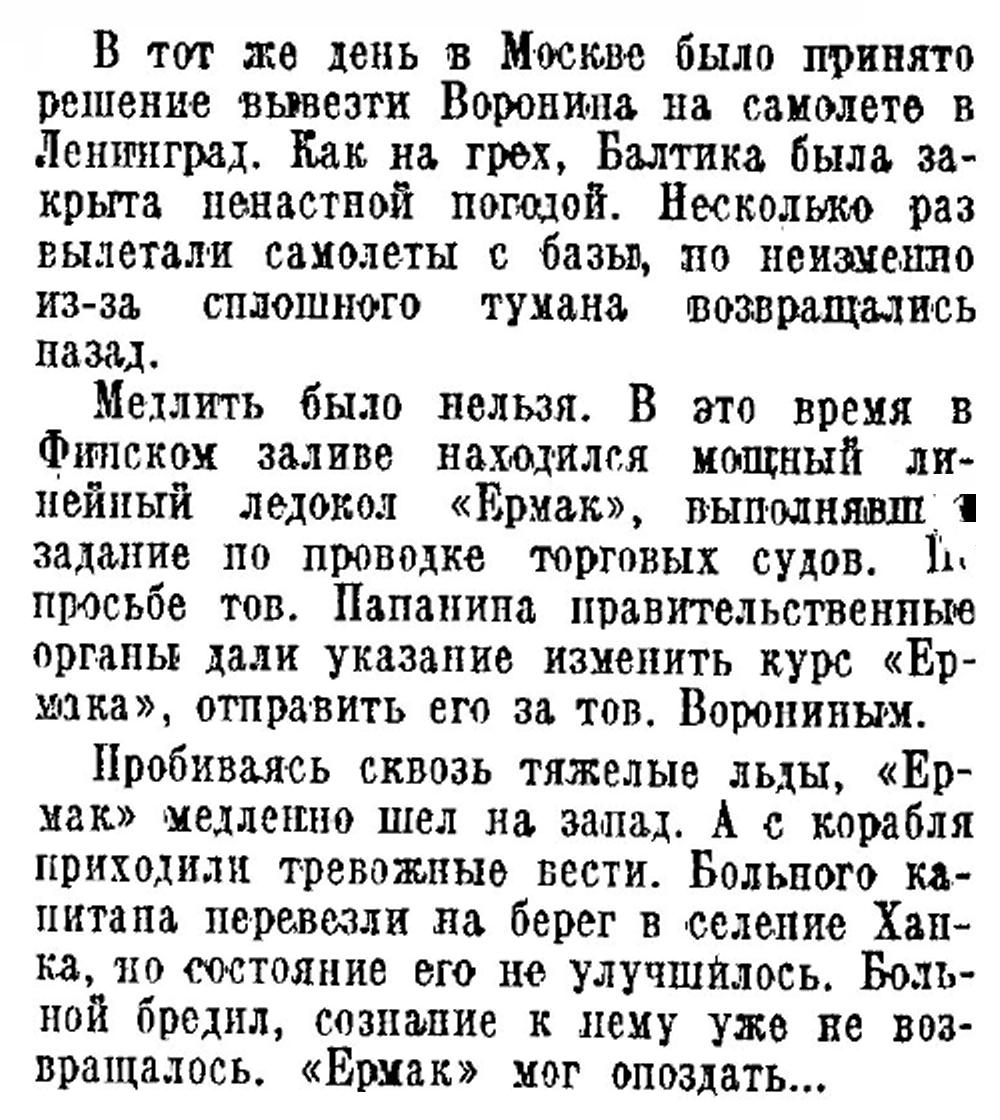 Медлить было нельзя. В это время в Финском заливе находился мощный линейный ледокол «Ермак», выполнявший задание по проводке торговых судов. По просьбе тов. Папанина правительственные органы дали указание изменить курс «Ермака», отправить его за тов. Ворониным.