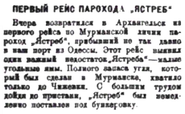 Вчера возвратился в Архангельск из первого рейса по Мурманской линии пароход "Ястреб", прибывший не так давно в наш порт из Одессы. Этот рейс выявил один важный недостаток "Ястреба" — малые угольные ямы. Полного запаса угля, который был сделан в Мурманске, хватило только до Чижевки. С большим трудом дойдя до пристани, "Ястреб" был немедленно поставлен под бункеровку.