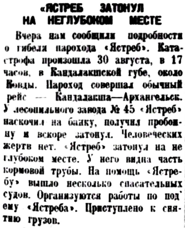 Вчера нам сообщили подробности о гибели парохода "Ястреб". Катастрофа произошла 30 августа, в 17 часов, в Кандалакшской губе, около Ковды. Пароход совершал обычный рейс — Кандалакша — Архангельск. У лесопильного завода №45 "Ястреб" наскочил на банку, получил пробоину в вскоре затонул. Человеческих жертв нет. "Ястреб" затонул на неглубоком месте. У него видна часть кормовой трубы. На помощь "Ястребу" вышло несколько спасательных судов. Организуются работы по подъему "Ястреба". Приступлено к снятию грузов.