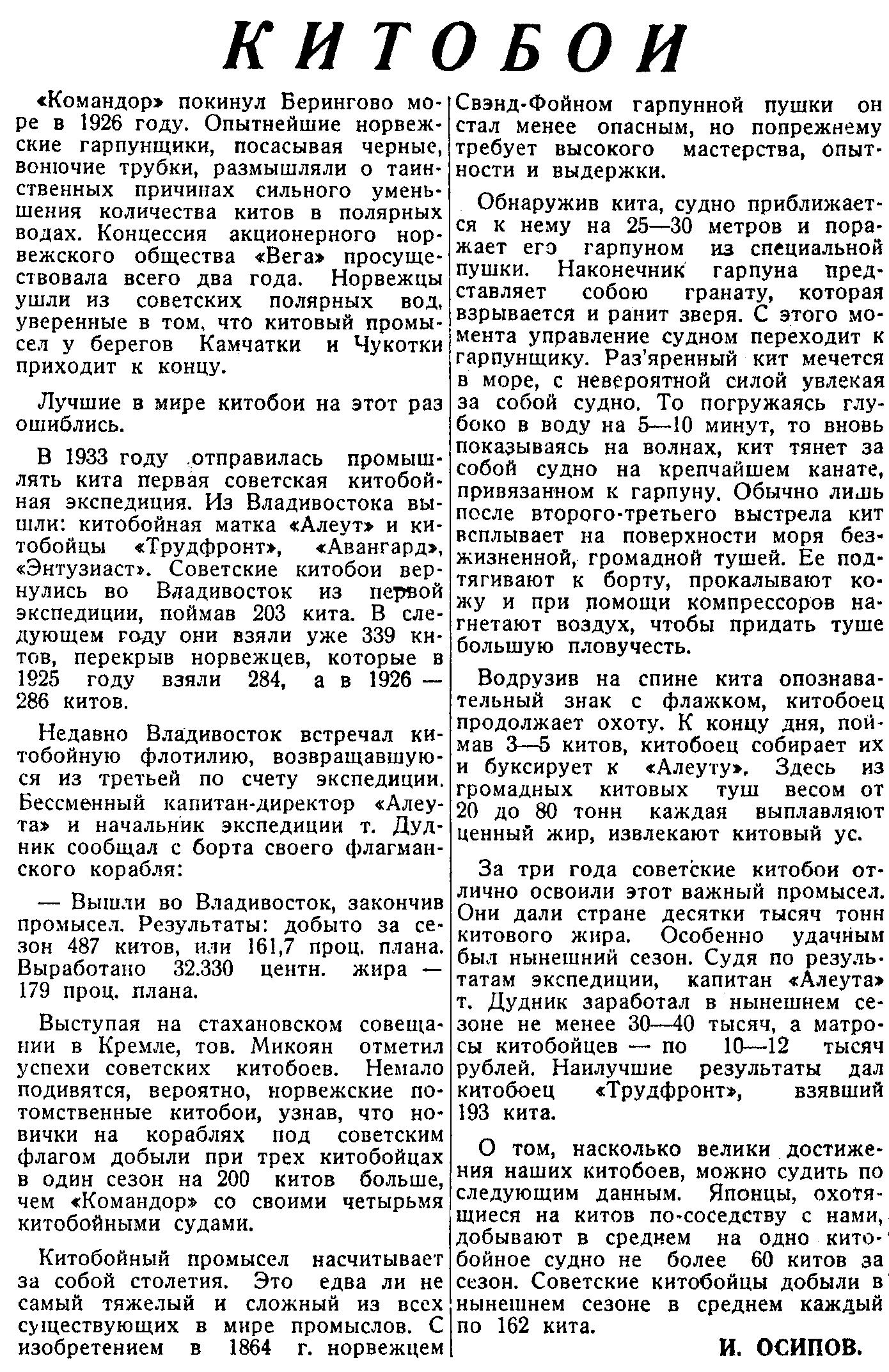 За три года советские китобои отлично освоили этот важный промысел. Они дали стране десятки тысяч тонн китового жира. Особенно удачным был нынешний сезон. Судя по результатам экспедиции, капитан «Алеута» т. Дудник заработал в нынешнем сезоне не менее 30—40 тысяч, а матросы китобойцев — по 10—12 тысяч рублей. Наилучшие результаты дал китобоец «Трудфронт», взявший 193 кита.
