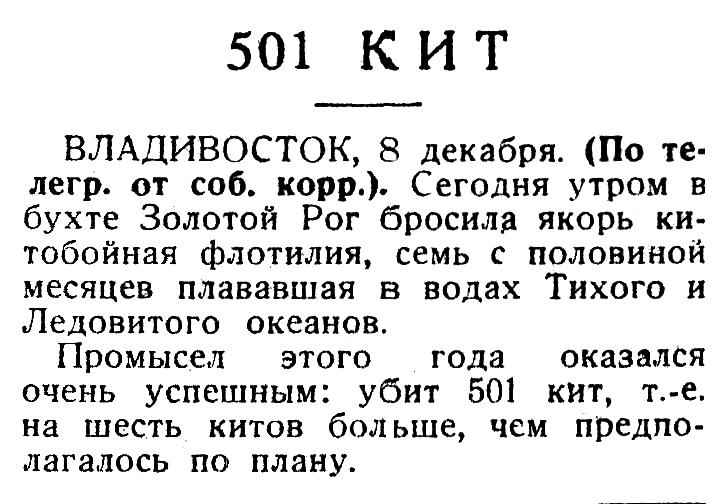 Петропавловск-Камчатский. Второй месяц в районе Камчатки промышляет советская китобойная флотилия. Уже добыто свыше 150 китов, в том числе два чрезвычайно редких экземпляра. Один из китов имеет в длину 22,5 метра и весит около 5.400 пудов, вес второго — 7.200 пудов.