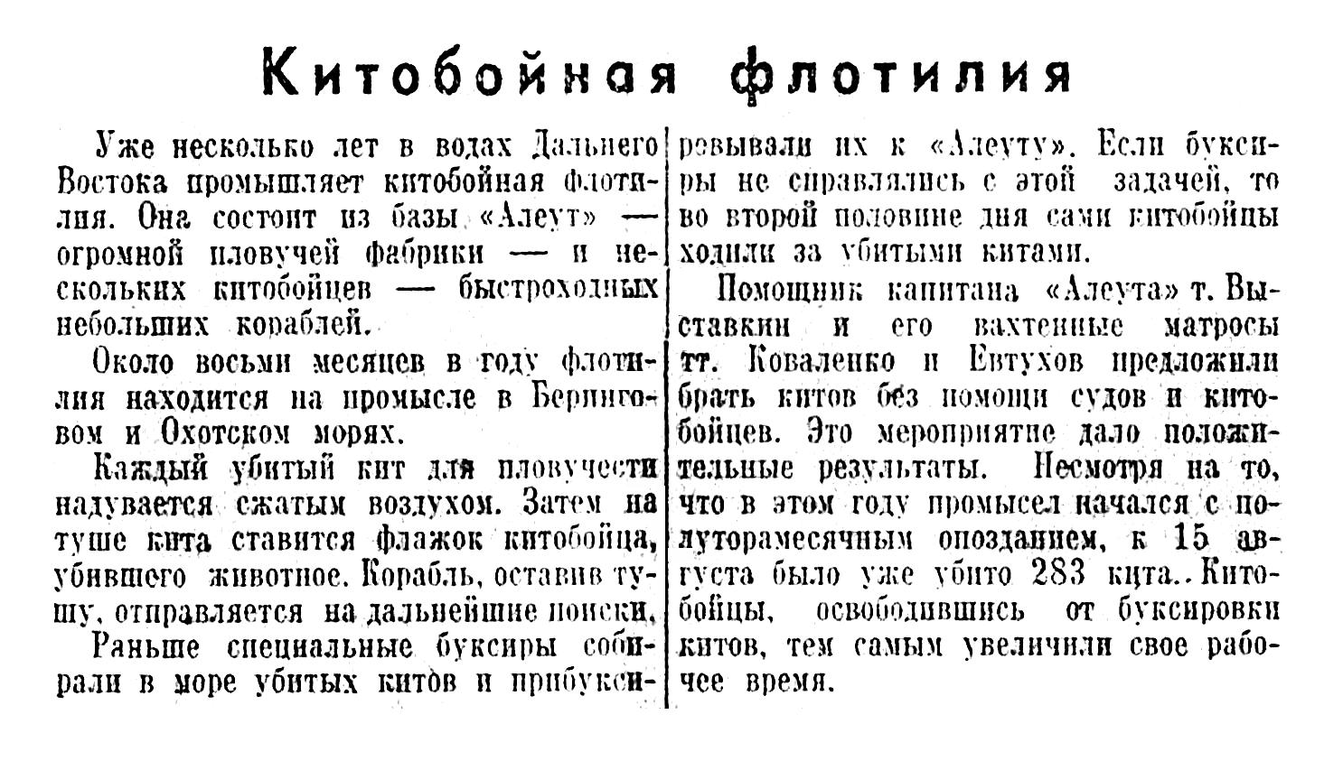 Помощник капитана «Алеута» т. Выставкин и его вахтенные матросы тт. Коваленко и Евтухов предложили брать китов без помощи судов и китобойцев. Это мероприятие дало положительные результаты. Несмотря на то, что в этом году промысел начался с полуторамесячным опозданием, к 15 августа было уже убито 283 кита. Китобойцы, освободившись от буксировки китов, тем самым увеличили свое рабочее время.