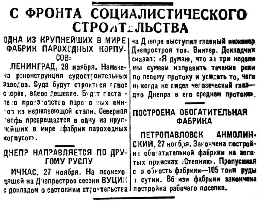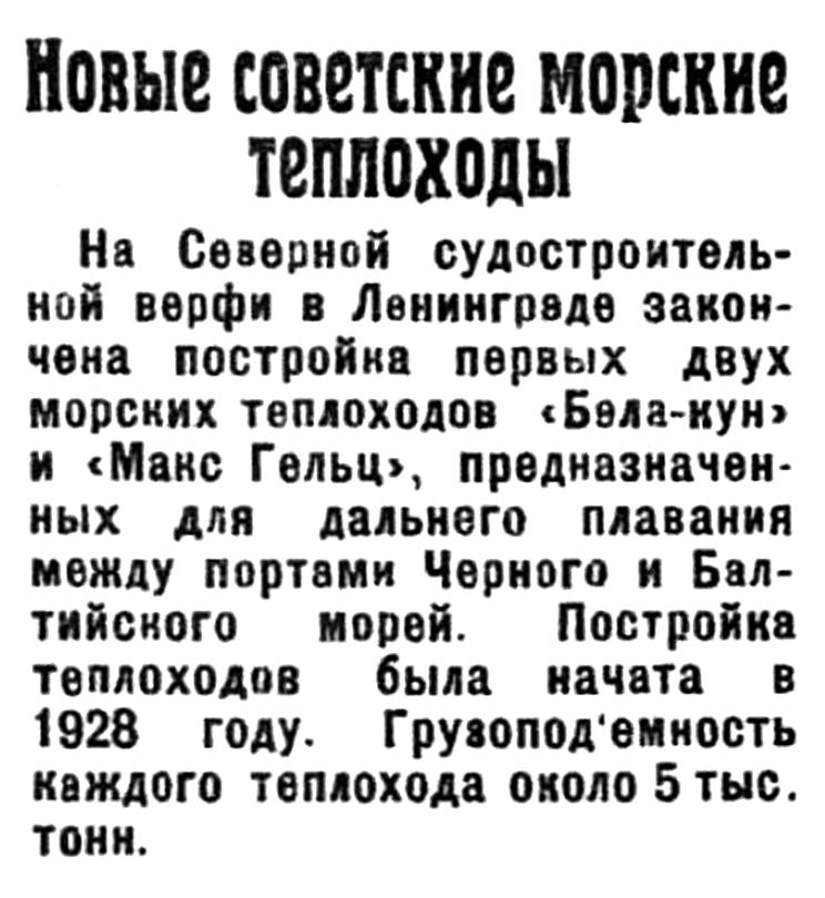 На Северной судостроительной верфи в Ленинграде закончена постройка первых двух морских теплоходов "Бела-кун" и "Макс Гельц", предназначенных для дальнего плавания между портами Черного и Балтийского морей. Постройка теплоходов была начата в 1928 году. Грузоподъемность каждого теплохода около 5 тыс. тонн.