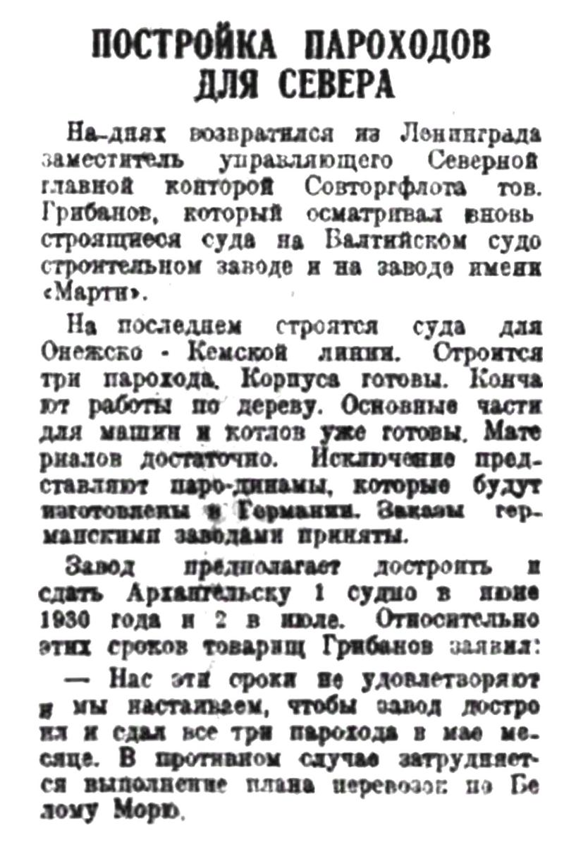 Завод предполагает достроить и сдать Архангельску 1 судно в июне 1930 года и 2 в июле. Относительно этих сроков товарищ Грибанов заявил: