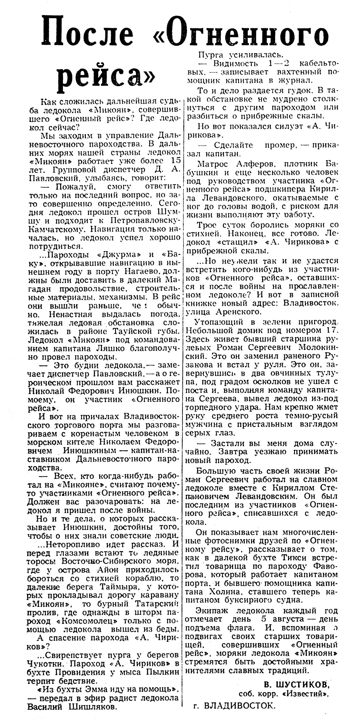 ... Но неужели так и не удастся встретить кого-нибудь из участников «Огненного рейса», оставшихся и после войны на прославленном ледоколе? И вот в записной книжке новый адрес: Владивосток, улица Аренского.