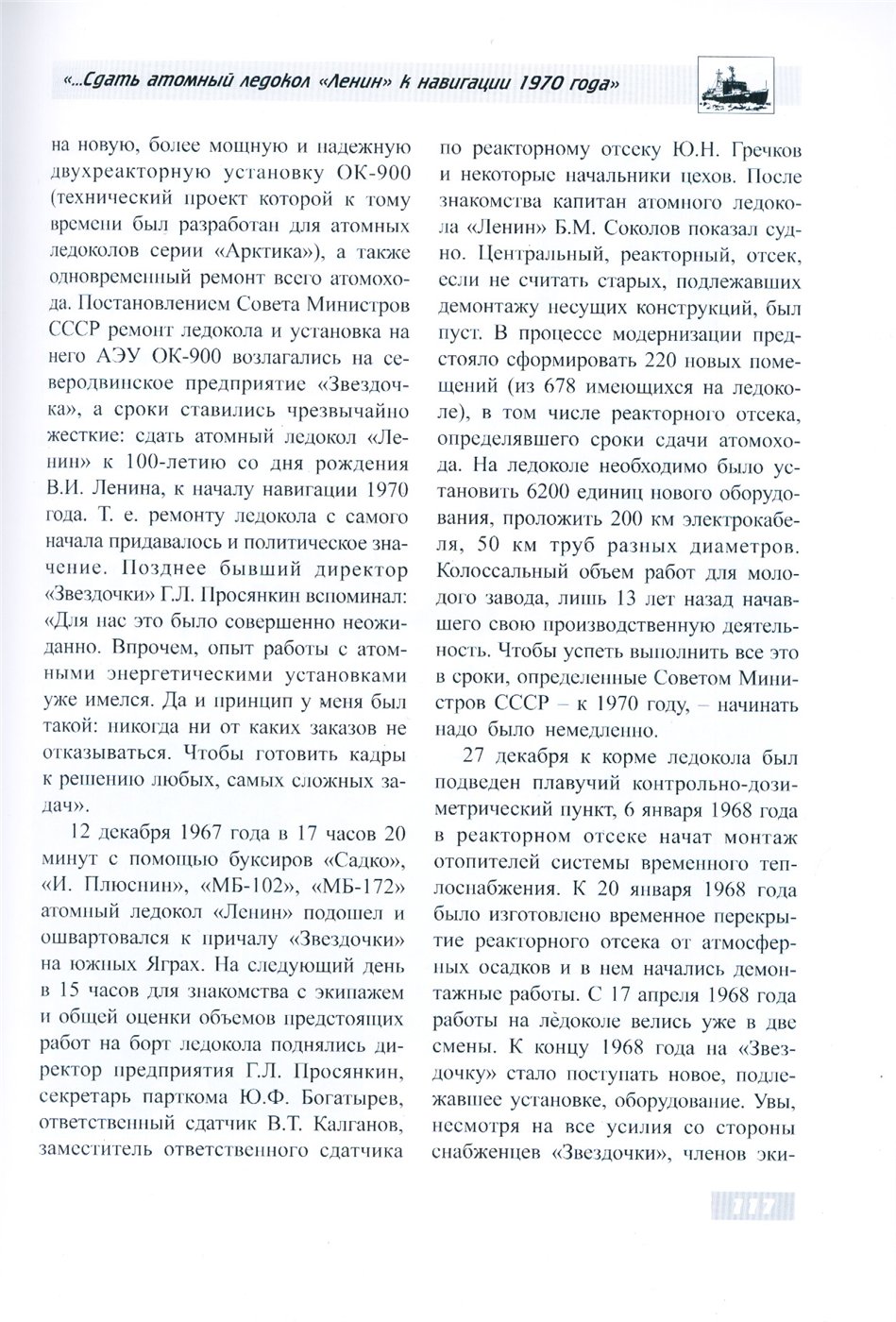 12 декабря 1967 года в 17 часов 20 минут с помощью буксиров «Садко». «И. Плюснин», «МБ-102», «МБ-172» атомный ледокол «Ленин» подошел и ошвартовался к причалу «Звездочки» на южных Яграх. На следующий день в 15 часов для знакомства с экипажем и общей оценки объемов предстоящих работ на борт ледокола поднялись директор предприятия Г. Л. Просянкин. секретарь парткома Ю. Ф. Богатырев, ответственный сдатчик ВТ. Калганов, заместитель ответственного сдатчика по реакторному отсеку Ю. Н. Греч ков и некоторые начальники цехов. Мосле знакомства капитан атомного ледокола «Ленин» Б. М. Соколов показал судно. Центральный, реакторный, отсек, если не считать старых, подлежавших демонтажу несущих конструкций, был пуст. В процессе модернизации предстояло сформировать 220 новых помещений (из 678 имеющихся на ледоколе), в том числе реакторного отсека, определявшего сроки сдачи атомохода. На ледоколе необходимо было установить 6200 единиц новою оборудования, проложить 200 км электрокабеля, 50 км труб разных диаметров. Колоссальный объем работ для молодого завода, лишь 13 лет назад начавшего свою производственную деятельность, Чтобы успеть выполнить все это в сроки, определенные Советом Министров СССР к 1970 году, начинать надо было немедленно.