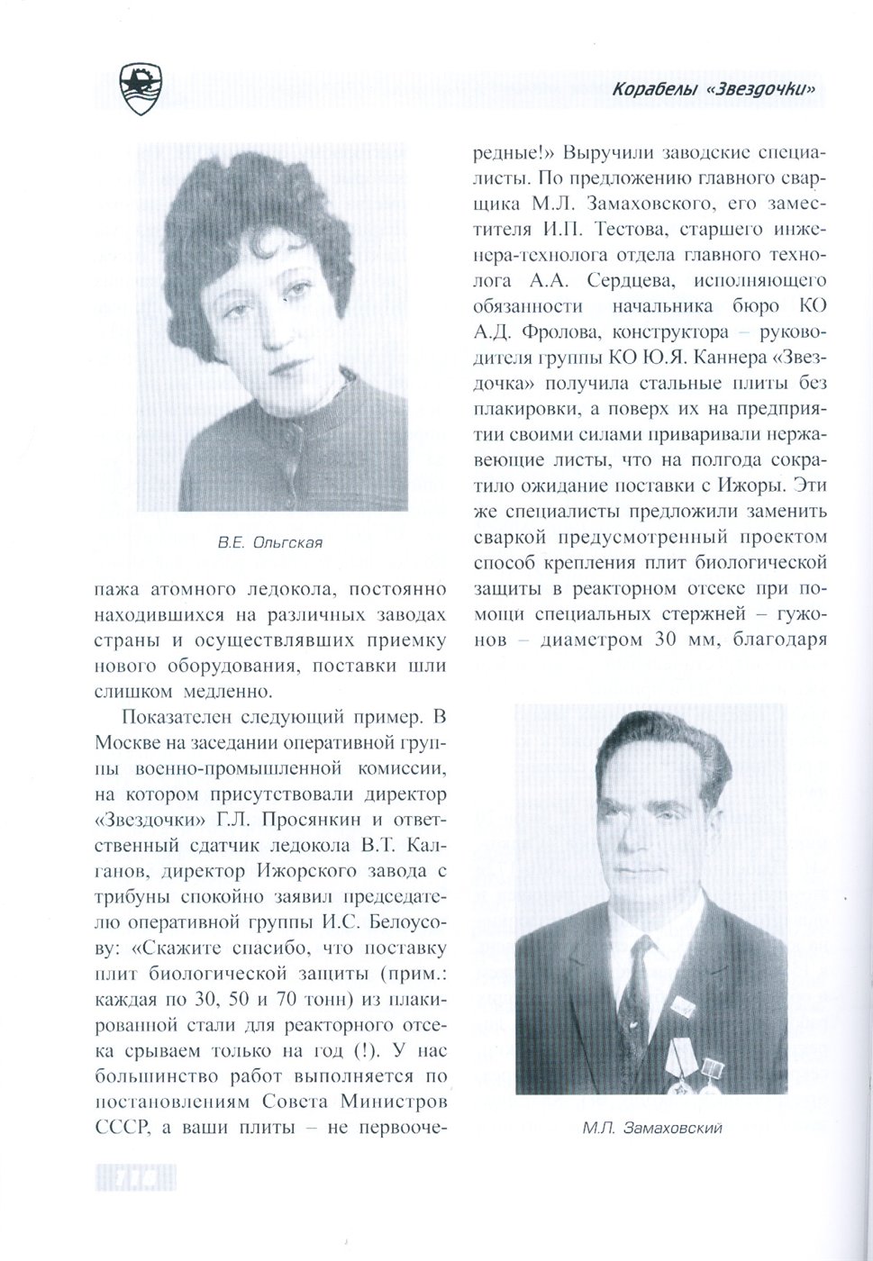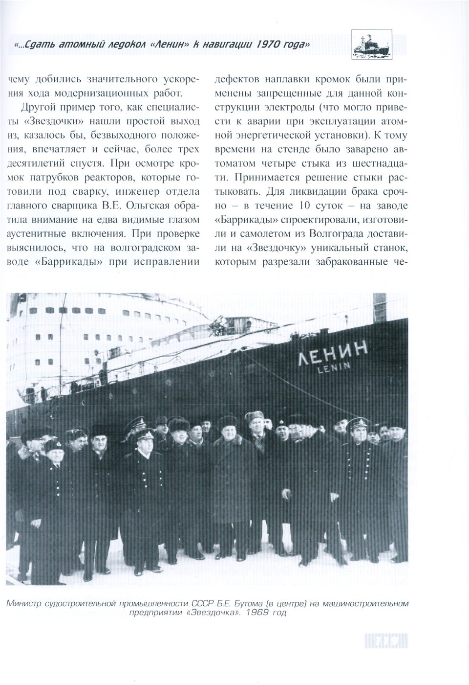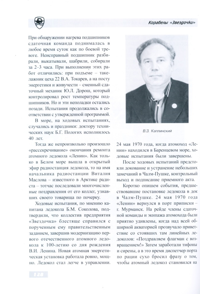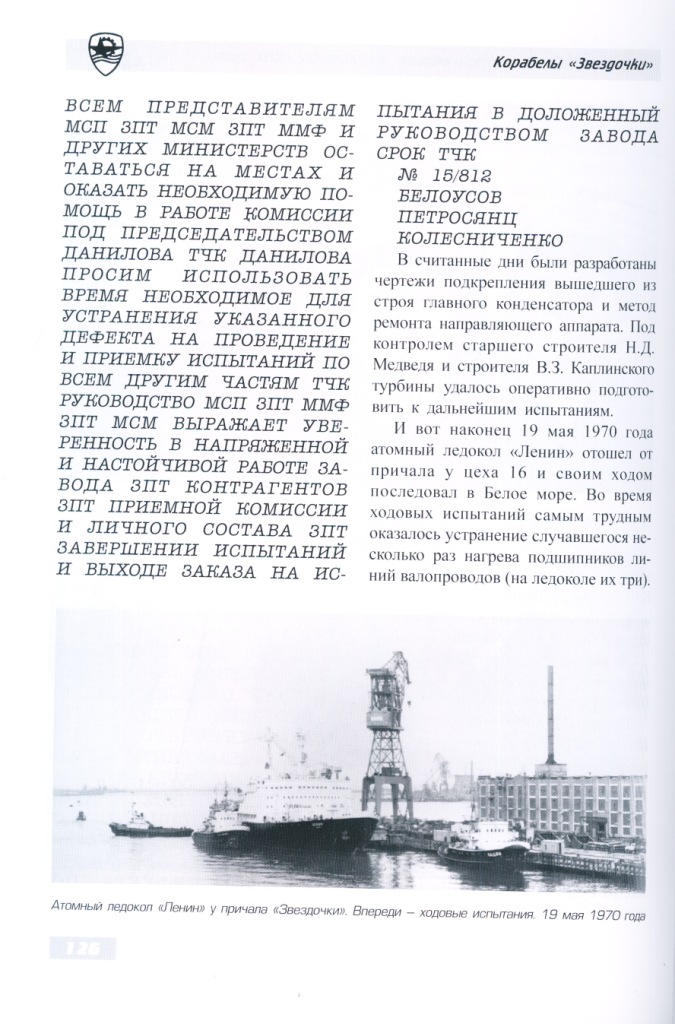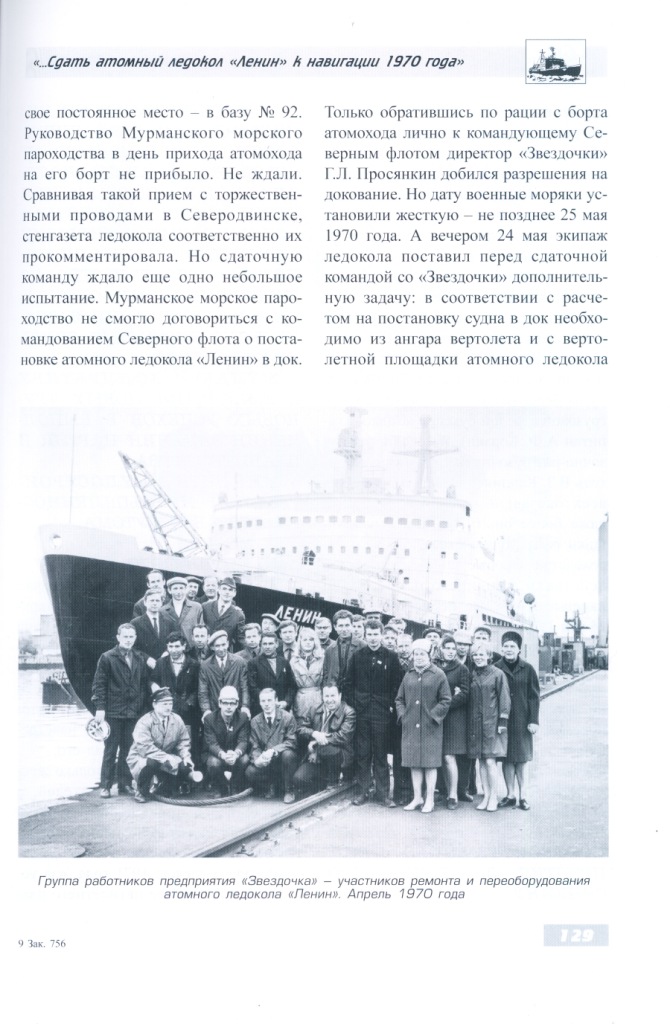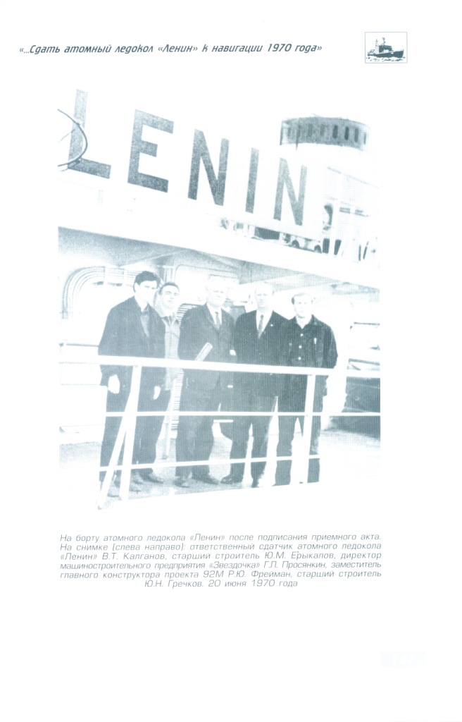 Назовем также членов экипажа атомного ледокола «Ленин», с которыми корабелы «Звездочки» в основном решали вопросы, связанные с ремонтом и переоборудованием атомохода: капитан Б.М. Соколов, главный инженер-механик И.К. Мочешников, старший инженер-механик О.Г. Пашнин, старший инженер-электромеханик А.В. Баранов, начальник службы радиационной безопасности О.И. Соколов, начальник службы КИП О.М. Хованский.