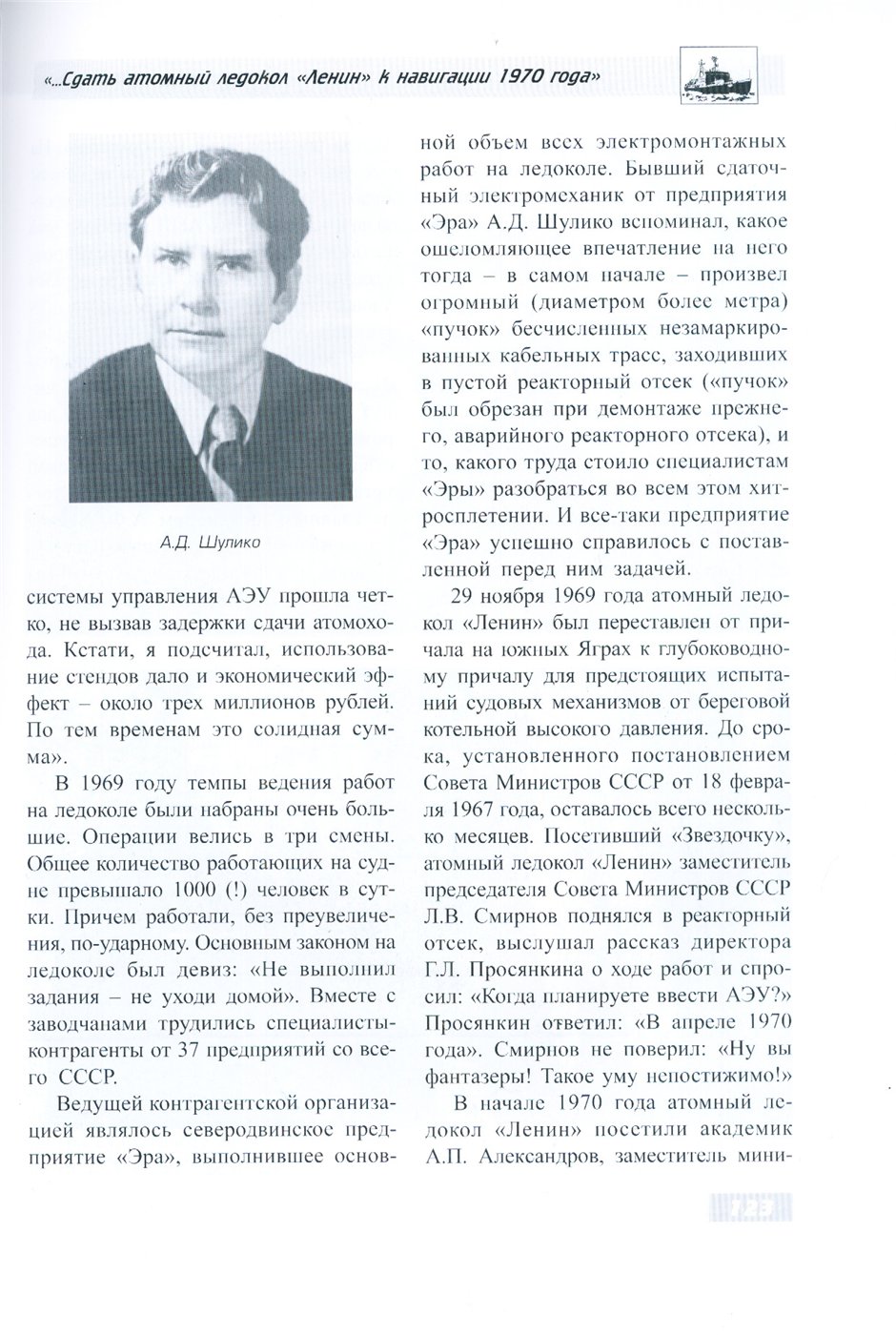 В начале 1970 года атомный ледокол «Ленин» посетили академик А. П. Александров, заместитель министра судостроительной промышленности СССР И. С. Белоусов. заместитель начальника Мурманского морскою пароходства Л. T. Данилов, члены военно-промышленной комиссии. Академик Л. П. Александров очень внимательно осмотрел все помещения реакторного отсека, тщательно, до деталей, уточняя, какие комплектующие элементы используются в системе управления АЭУ, какие заводы являются поставщиками, тем, как идет наладка системы управления АЭУ на стендах.