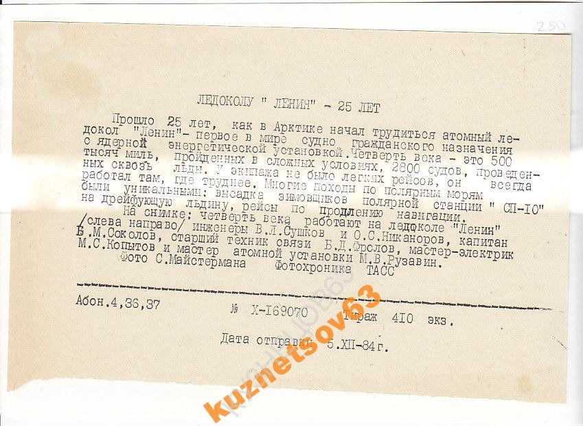 ...В сопровождении инженера поднимаемся на борт атомохода. Это корабль высотой в шестиэтажный дом. Инженер знакомит с основными размерами судна, которое станет флагманом советского арктического ледокольного., флота. Длина ледокола — 134 метра, наибольшая ширина — более 27 метров.