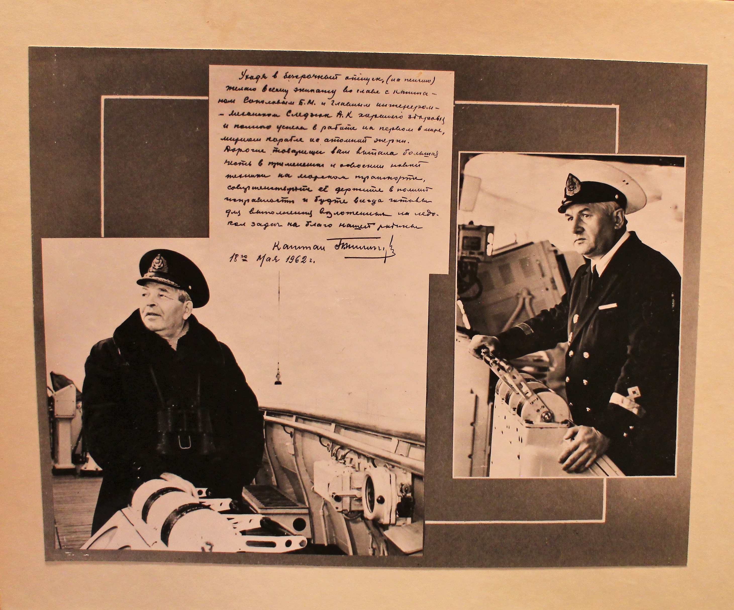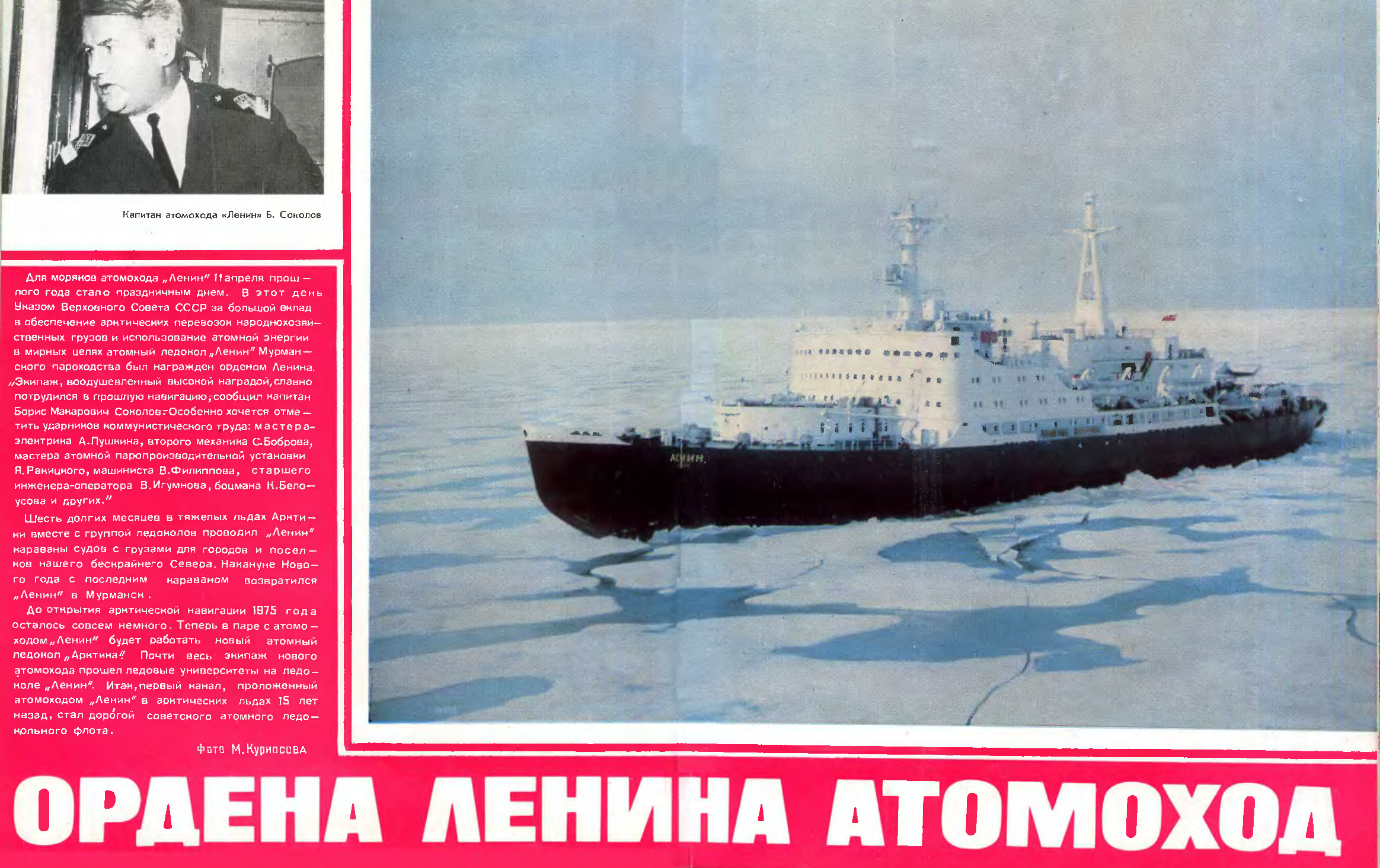 В этом самое главное преимущество и новизна небывалого в мире ледокола. Задача использования ядерной энергии в качестве топлива для транспортных судов смело решается советскими учеными, инженерами на этом большом корабле. Нелегкая, но почетная задача потребовала создания новых турбин и генераторов, насыщения ледокола самыми новейшими механизмами и приборами дистанционного управления. Одних только электромоторов различных мощностей в отсеках судна будет свыше 500. а кабельные линии составят свыше 300 километров. Небывалая насыщенность ледокола машинной техникой приводит в восхищение даже бывалых моряков-полярников. Они уже пришли на судно. Здесь в процессе монтажа оборудования изучают новую технику будущий капитан ледокола известный полярник П. А. Пономарев, главный механик К. К. Долгополов, старшие механики 3. Г. Русаков, А. В. Неупокоев, Г. В. Гаршин. У всех у них за плечами не менее четверти века плавания.