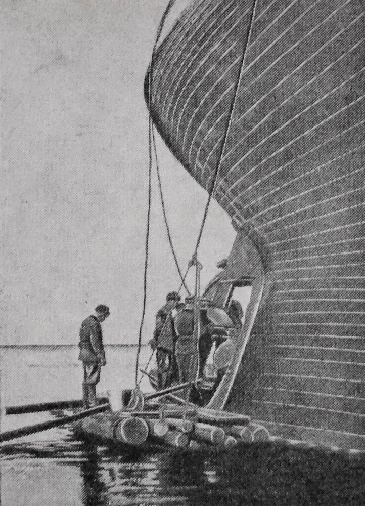 Когда подлодки не стало видно, мы осмотрели судно – оно оказалось перевернутым, носовая часть вверх килем. Оно уже скрылось из виду. Когда я был на льдине, наблюдал, что там было 2 человека. Искать их было не под силу и не было уверенности, что найдем их. В шлюпку я посадил 19 человек. Составили расписание гребцов посменно, на три смены. Пошли между льдинами на зюйд-вест, т.к. не было уверенности, что подлодка не вернется посмотреть наши трупы и, когда не найдет их, будет искать.