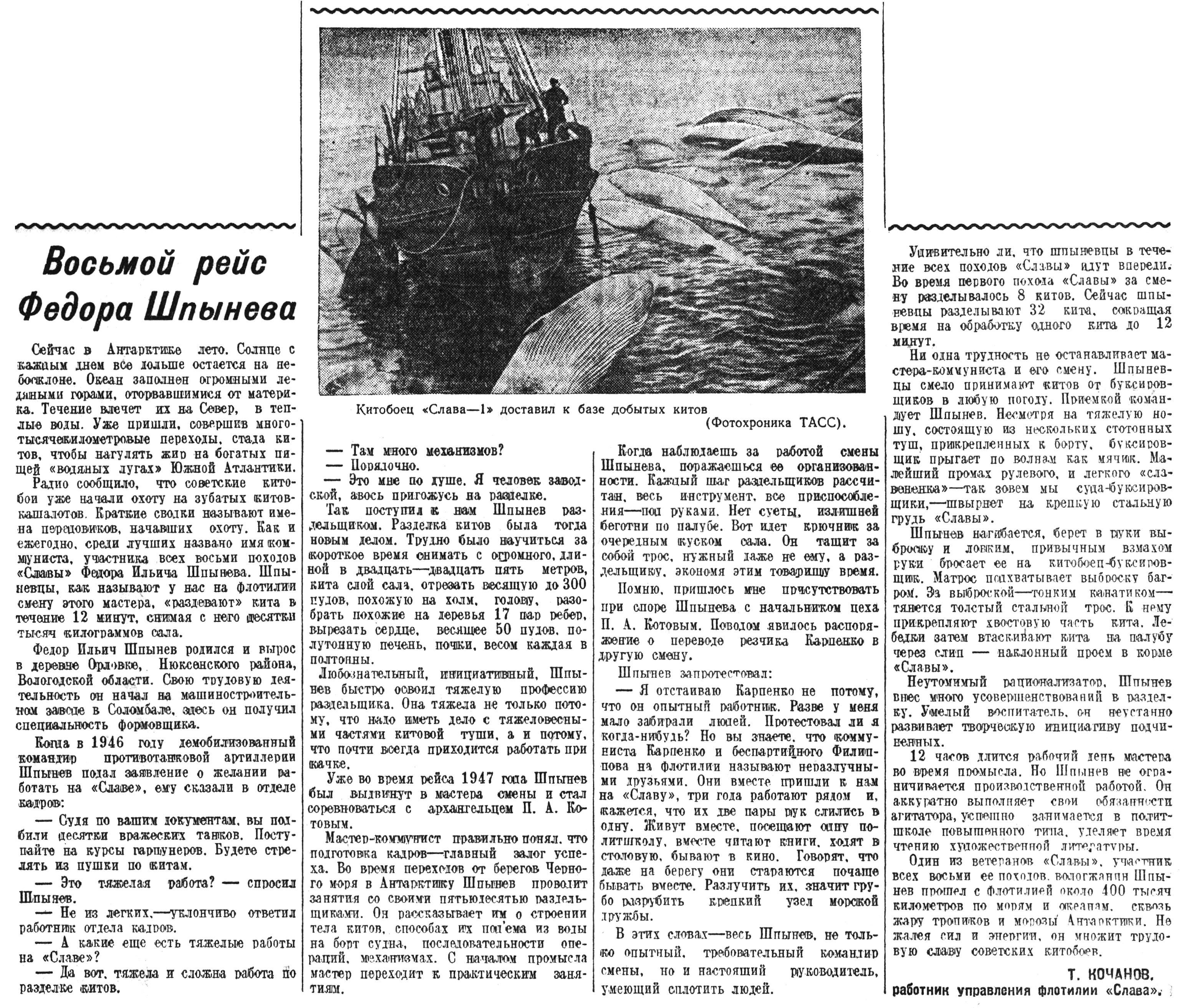 Один из ветеранов «Славы», участник всех восьми ее походов, вологжанин Шпынев прошел с флотилией около 400 тысяч километров по морям и океанам, сквозь жару тропиков и морозы Антарктики. Не жалея сил и энергии, он множит трудовую славу советских китобоев.