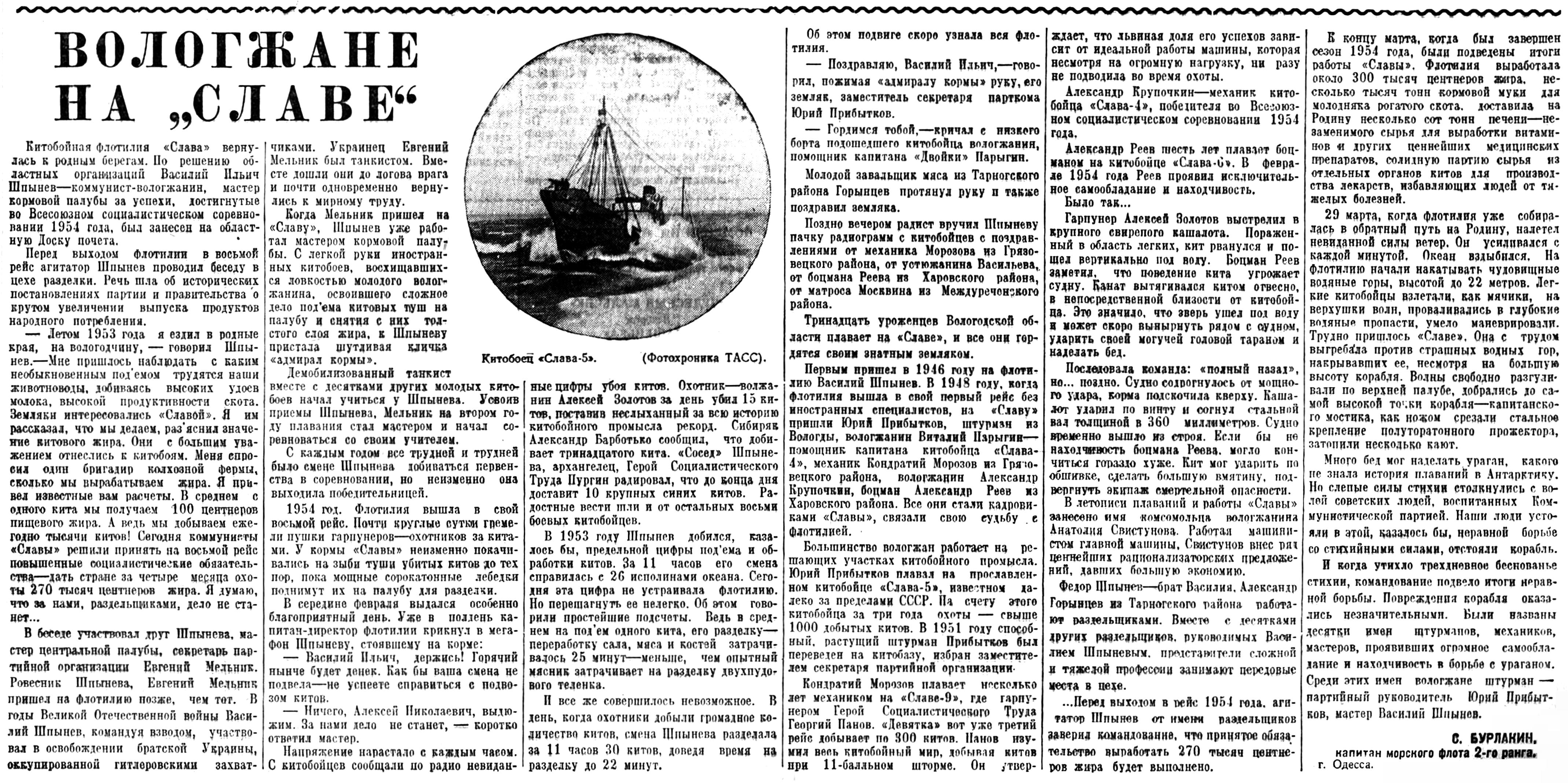 Китобойная флотилия «Слава» вернулась к родным берегам. Но решению областных организаций Василии Ильич Шпынев — коммунист-вологжанин, мастер кормовой палубы за успехи, достигнутые во Всесоюзном социалистическом соревновании 1954 года, был занесен на областную Доску почета.