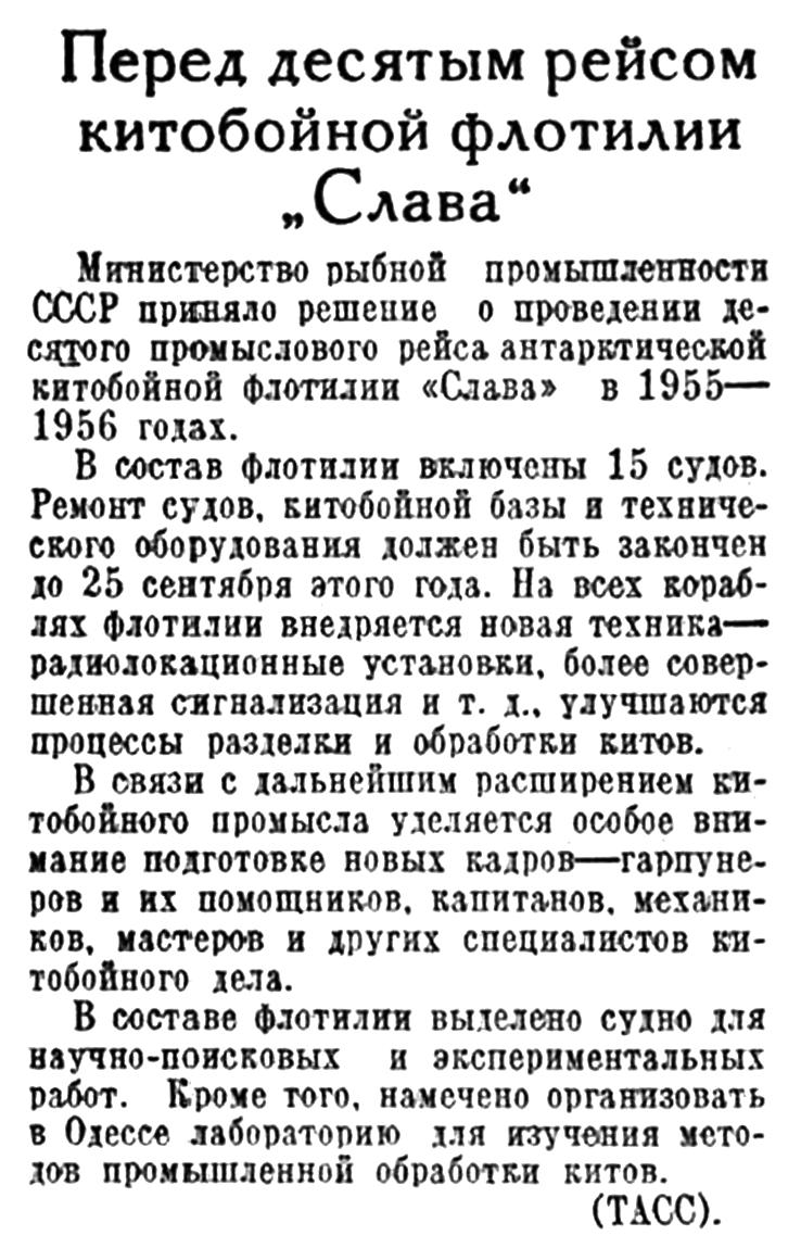 На днях из Черного моря в Антарктику, в район промысла экспедиции «Слава» отправился танкер «Иосиф Сталин». Он доставит советским китобоям различные грузы и примет много тысяч тонн китового жира."