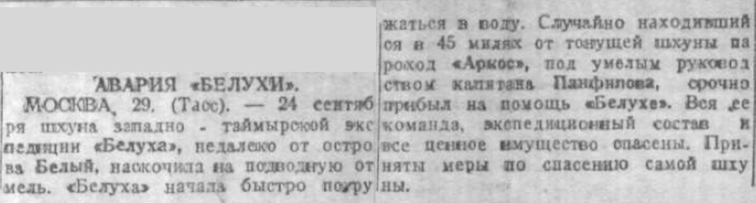 МОСКВА, 29. (Тасс). — 24 сентября шхуна западно-таймырской экспедиции «Белуха», недалеко от острова Белый, наскочила на подводную отмель. «Белуха» начала быстро погружаться в воду. Случайно находившийся в 45 милях от тонувшей шхуны пароход «Аркос», под умелым руководством капитана Панфилова, срочно прибыл на помощь «Белухе». Вся ее команда, экспедиционный состав и все ценное имущество спасены. Приняты меры по спасению самой шхуны.