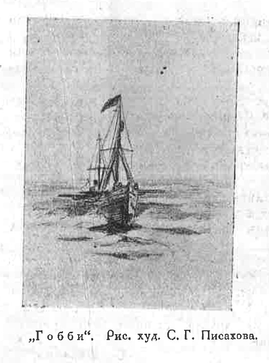 ЛЕДОКОЛ «ЛЕНИН», 30 августа. Утром 29 августа шхуна «Белуха» вошла в Югорский Шар и пришвартовалась к красавцу-ледоколу «Ленин», проводнику Карской экспедиции. Накануне радист «Белухи» Сысолятин перехватил радио, из отрывка которого можно было узнать, что шхуна Комсеверопути «Зверобой» (бывшая «Браганца») вчера утром потерпела аварию в устье реки Пясины (восточнее устья Енисея), «Зверобой» ставил зимовку у Карской стороны Таймырского полуострова и занимался звериным промыслом к северу от острова Диксона На ледоколе «Ленин» мы узнали о полете Чухновского на северо-восток от острова Диксона. В воздухе на самолете перегорело радио. Связь Чухновского с Карской экспедицией временно прервана. На помощь терпящим аварию вышел ледокол «Малыгин» во главе с начальником Карской экспедиции Евгеновым. Шхуна «Белуха» пойдет по пути к месту аварии «Зверобоя», возьмет с него ружья и патроны, не уклоняясь от своей прямой цели — достижения устья Лены