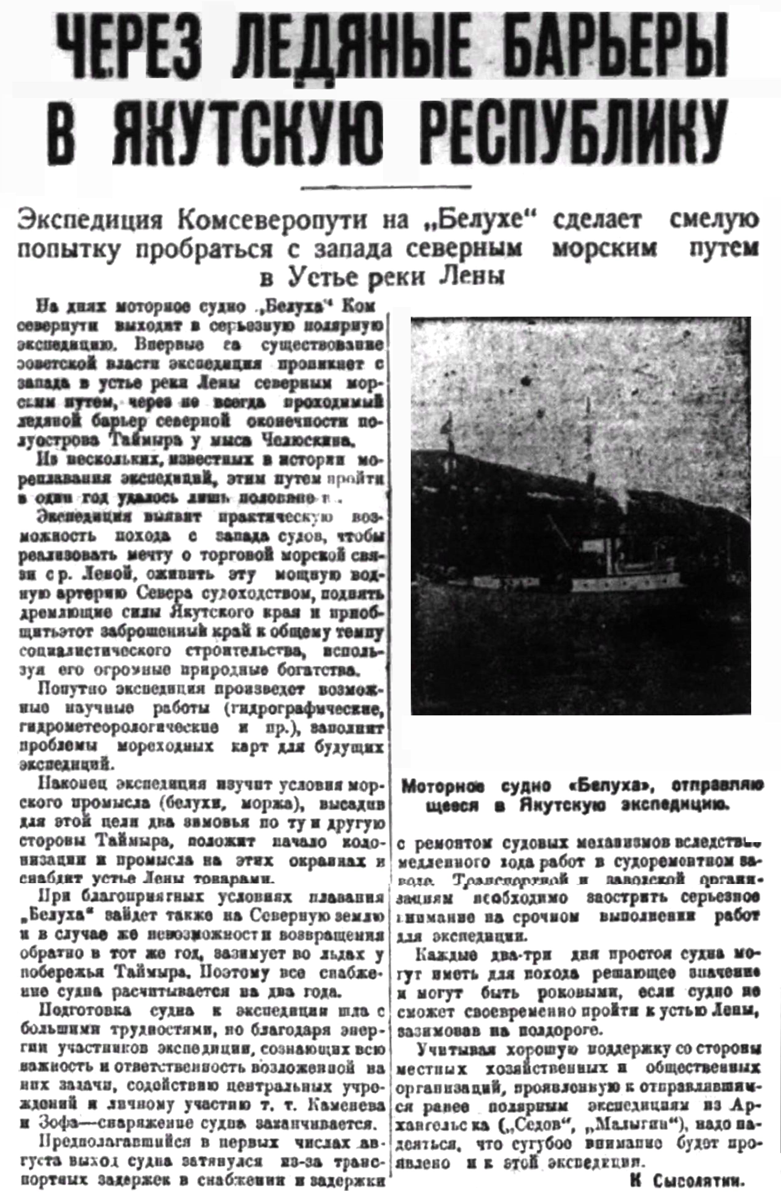 На днях моторное судно "Белуха" Комсеверпути выходят в серьезную полярную экспедицию. Впервые за существование советской власти экспедиция проникнет с запада в устье реки Лены северным морским путем, через не всегда проходимый ледяной барьер северной оконечности полуострова Таймыра у мыса Челюскина.