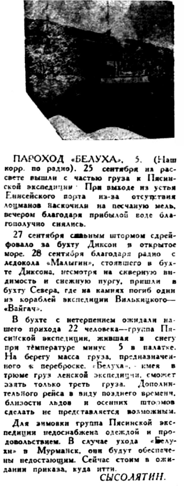 ПАРОХОД "БЕЛУХА". 5. (Наш корр. по радио). 25 сентября на рассвете вышли с частью груза к Пясинской экспедиции. При выходе из устья Енисейского порта из-за отсутствия лоцманов наскочили на песчаную мель, вечером благодаря прибылой воде благополучно снялись.