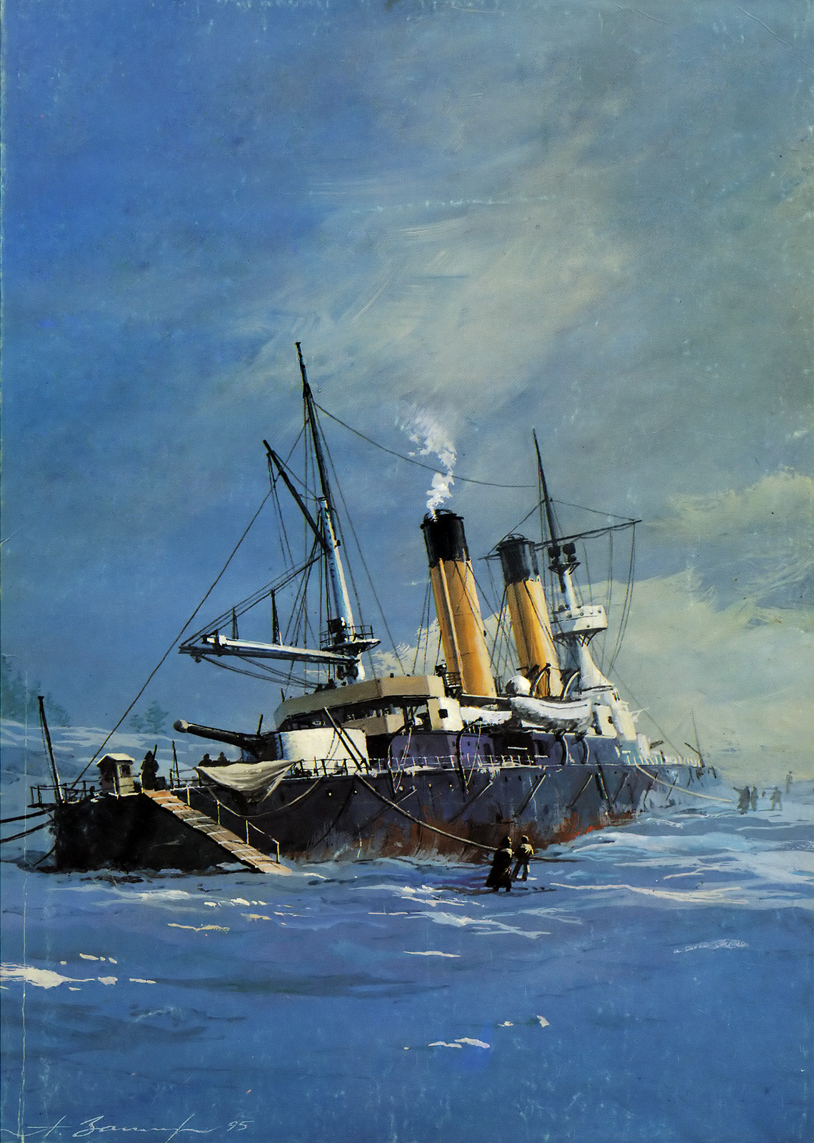 рисунок: «Броненосец береговой обороны «Генерал-адмирал Апраксин» на камнях у острова Гогланд» А.Ю.Заикина.
