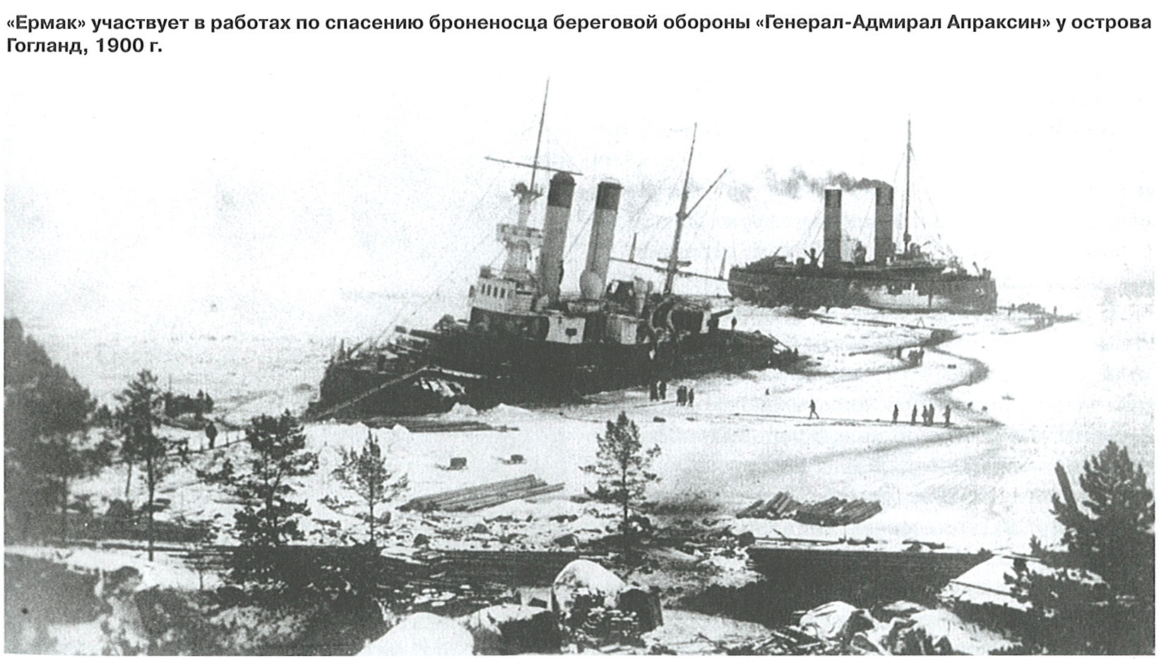 ... Важную роль сыграл «Ермак» в спасении бро­неносца береговой обороны «Генерал-адмирал Ап­раксин», который 13 ноября 1899 г. в результате на­вигационной ошибки выскочил на отмель у юго-восточного берега острова Гогланд. Сразу же ста­щить с мели броненосец не удалось, поэтому спаса­тельные работы пришлось отложить до весны. При этом возникла опасность того, что льды раздавят корпус броненосца. Тут-то и понадобился «Ермак». Кроме того, на ледоколе к «Апраксину» доставля­лись различные материалы и уголь. В апреле 1900 г. «Ермаку» удалось стащить броненосец с ка­менной гряды и благополучно привести его в Аспе.