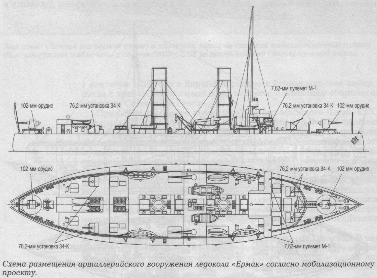 Схема размещения артиллерийского вооружения ледокола «Ермак» согласно мобилизационному проекту.