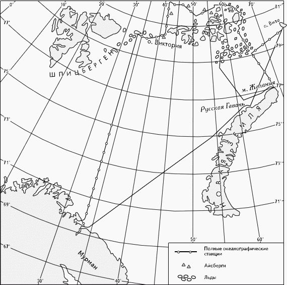 Однако включать в обязательную программу такие наблюдения было слишком рискованно. Поэтому вариант обхода Земли Франца-Иосифа с севера был как бы условным: решили пойти этим путем, если представится возможность. О том, что это возможно, говорил анализ температуры атлантических вод. Температура Нордкапского течения все еще держалась выше средней, и можно было предполагать, что максимум температуры, наблюдавшийся на Кольском меридиане в 1930 г., в 1932 г. продвинется в район между Землей Франца-Иосифа и Северной Землей и значительно уменьшит здесь ледовитость».